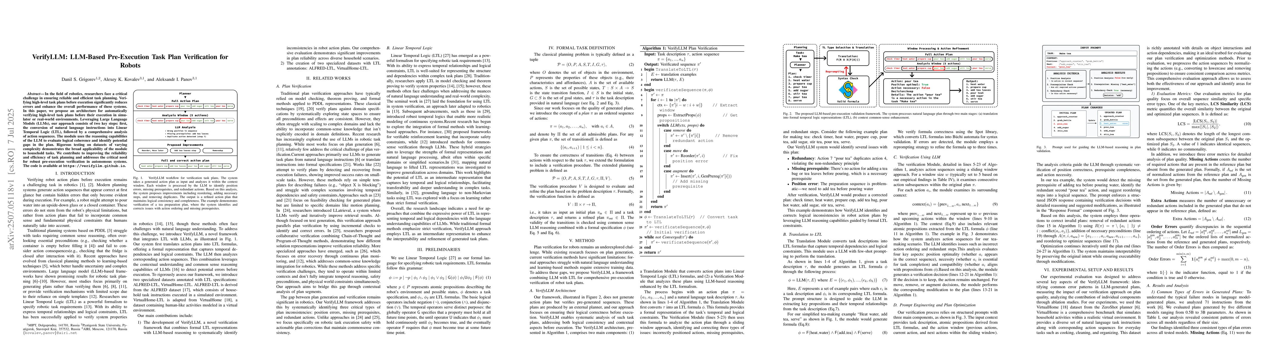 In the field of robotics, researchers face a critical challenge in ensuring reliable and efficient task planning. Verifying high-level task plans before execution significantly reduces errors and enhance the overall performance of these systems. In this paper, we propose an architecture for automatically verifying high-level task plans before their execution in simulator or real-world environments. Leveraging Large Language Models (LLMs), our approach consists of two key steps: first, the conversion of natural language instructions into Linear Temporal Logic (LTL), followed by a comprehensive analysis of action sequences. The module uses the reasoning capabilities of the LLM to evaluate logical coherence and identify potential gaps in the plan. Rigorous testing on datasets of varying complexity demonstrates the broad applicability of the module to household tasks. We contribute to improving the reliability and efficiency of task planning and addresses the critical need for robust pre-execution verification in autonomous systems. The code is available at https://verifyllm.github.io.