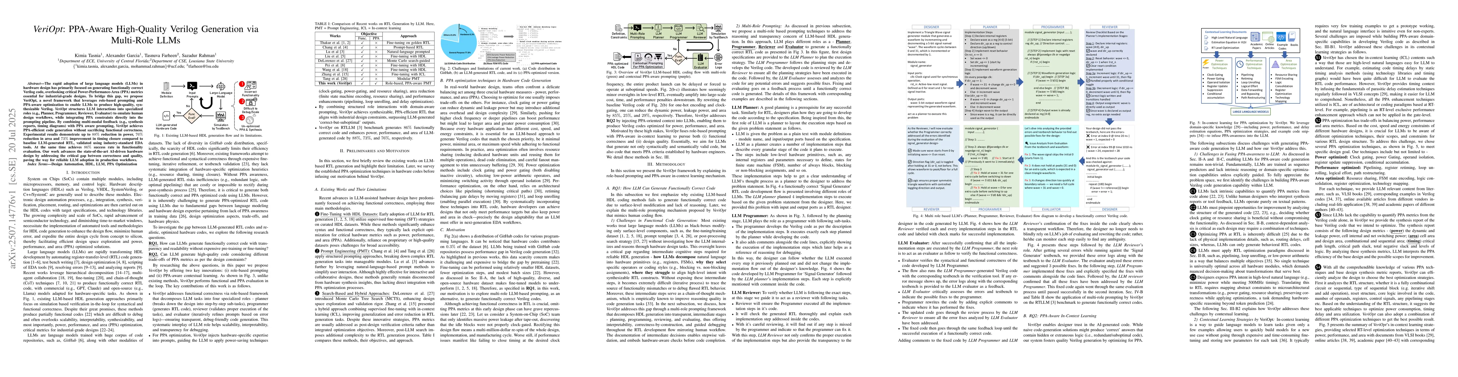 VeriOpt introduces a novel multi-role prompting framework that integrates PPA-aware optimization into LLM-based hardware design, ensuring transparent, debug-friendly, and functionally correct RTL code generation.