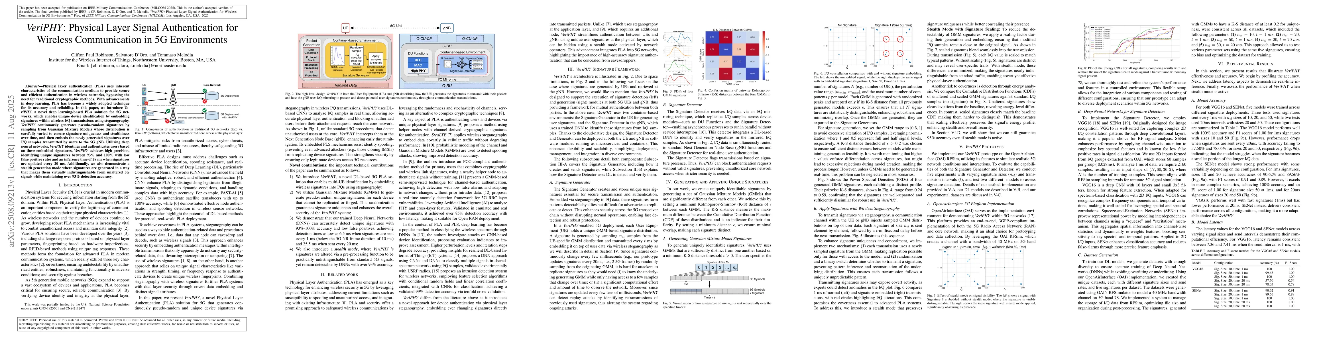 Physical layer authentication (PLA) uses inherent characteristics of the communication medium to provide secure and efficient authentication in wireless networks, bypassing the need for traditional cryptographic methods. With advancements in deep learning, PLA has become a widely adopted technique for its accuracy and reliability. In this paper, we introduce VeriPHY, a novel deep learning-based PLA solution for 5G networks, which enables unique device identification by embedding signatures within wireless I/Q transmissions using steganography. VeriPHY continuously generates pseudo-random signatures by sampling from Gaussian Mixture Models whose distribution is carefully varied to ensure signature uniqueness and stealthiness over time, and then embeds the newly generated signatures over I/Q samples transmitted by users to the 5G gNB. Utilizing deep neural networks, VeriPHY identifies and authenticates users based on these embedded signatures. VeriPHY achieves high precision, identifying unique signatures between 93% and 100% with low false positive rates and an inference time of 28 ms when signatures are updated every 20 ms. Additionally, we also demonstrate a stealth generation mode where signatures are generated in a way that makes them virtually indistinguishable from unaltered 5G signals while maintaining over 93% detection accuracy.
