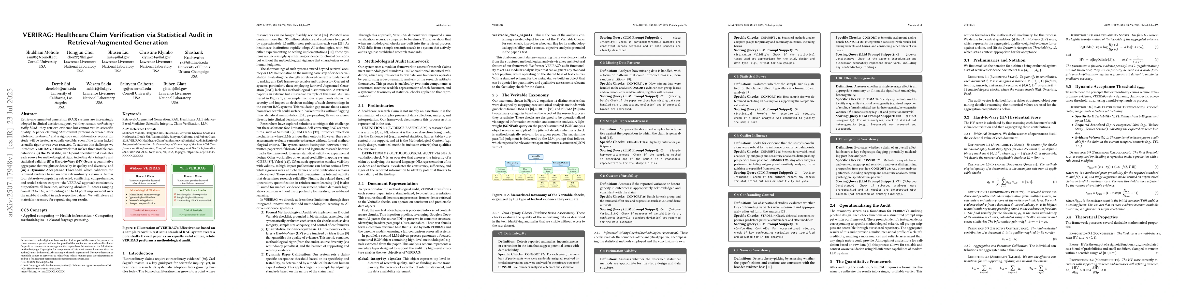 The research introduces VERIRAG, a framework for healthcare claim verification via statistical audit in retrieval-augmented generation. It includes a 11-point Veritable checklist for methodological rigor, a Hard-to-Vary (HV) Score for quantifying evidence quality, and a Dynamic Acceptance Threshold for adjusting evidence requirements based on claim extraordinariness.