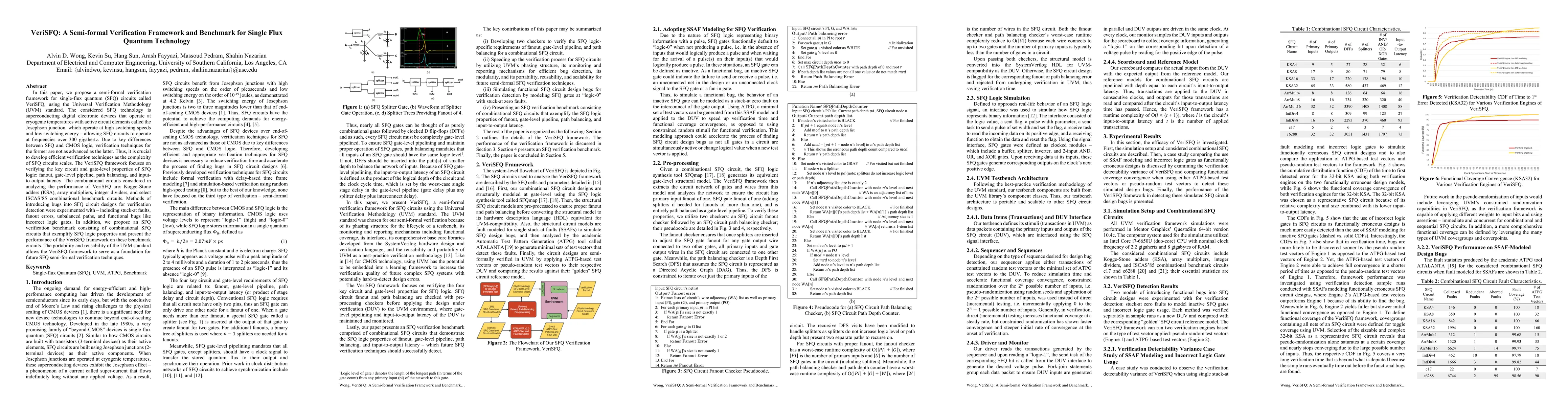 This paper introduces VeriSFQ, a semi-formal verification framework for single-flux quantum circuits using the UVM standard, focusing on fanout, pipeline, path balancing, and latency. It also proposes an SFQ verification benchmark to test the framework's efficacy in detecting various faults.