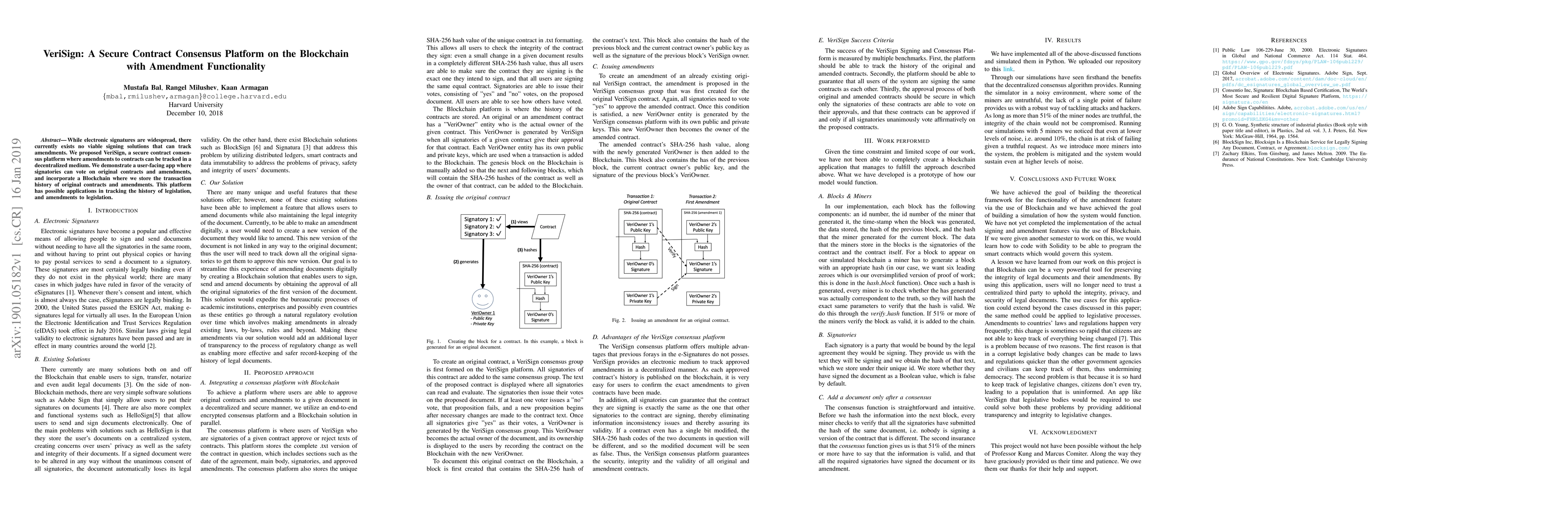 While electronic signatures are widespread, there currently exists no viable signing solutions that can track amendments. We proposed VeriSign, a secure contract consensus platform where amendments to contracts can be tracked in a decentralized medium. We demonstrate a user-facing app where signatories can vote on original contracts and amendments, and incorporate a Blockchain where we store the transaction history of original contracts and amendments. This platform has possible applications in tracking the history of legislation, and amendments to legislation.