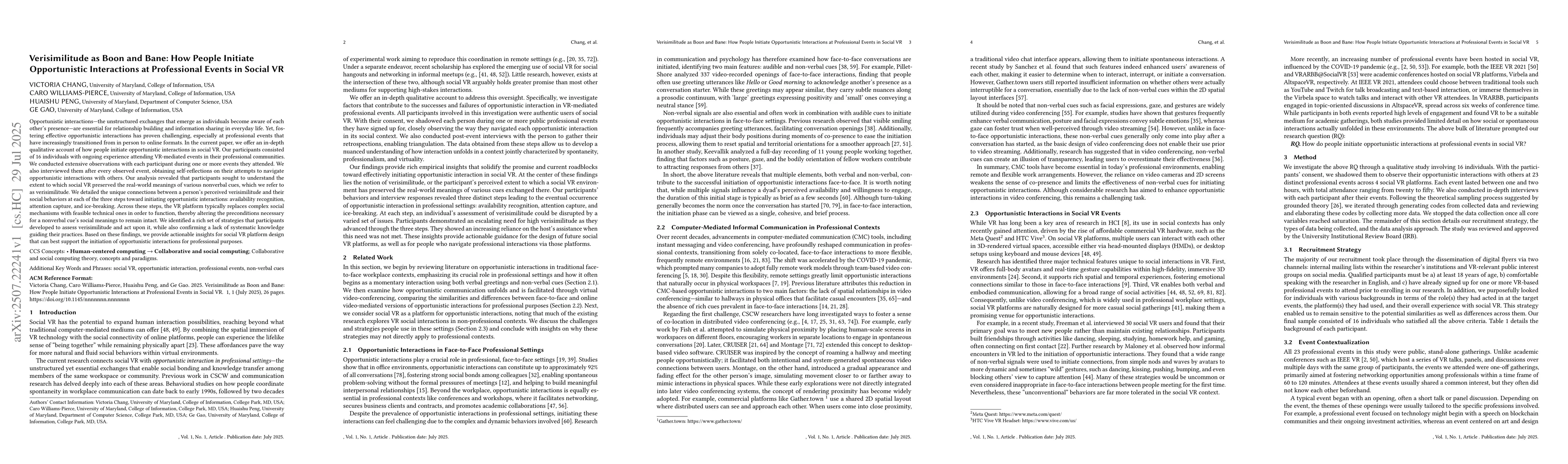 Opportunistic interactions-the unstructured exchanges that emerge as individuals become aware of each other's presence-are essential for relationship building and information sharing in everyday life. Yet, fostering effective opportunistic interactions has proven challenging, especially at professional events that have increasingly transitioned from in person to online formats. In the current paper, we offer an in-depth qualitative account of how people initiate opportunistic interactions in social VR. Our participants consisted of 16 individuals with ongoing experience attending VR-mediated events in their professional communities. We conducted extensive observations with each participant during one or more events they attended. We also interviewed them after every observed event, obtaining self-reflections on their attempts to navigate opportunistic interactions with others. Our analysis revealed that participants sought to understand the extent to which social VR preserved the real-world meanings of various nonverbal cues, which we refer to as verisimilitude. We detailed the unique connections between a person's perceived verisimilitude and their social behaviors at each of the three steps toward initiating opportunistic interactions: availability recognition, attention capture, and ice-breaking. Across these steps, the VR platform typically replaces complex social mechanisms with feasible technical ones in order to function, thereby altering the preconditions necessary for a nonverbal cue's social meanings to remain intact. We identified a rich set of strategies that participants developed to assess verisimilitude and act upon it, while also confirming a lack of systematic knowledge guiding their practices. Based on these findings, we provide actionable insights for social VR platform design that can best support the initiation of opportunistic interactions for professional purposes.