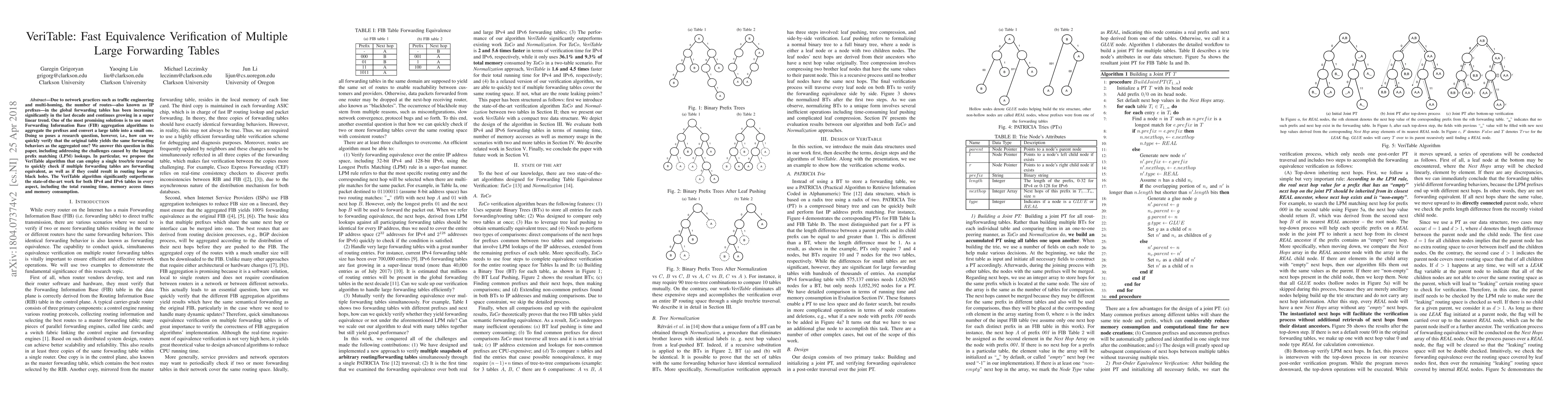 The VeriTable algorithm quickly verifies that large forwarding tables are equivalent and do not contain routing loops or black holes, outperforming existing solutions in speed and efficiency.