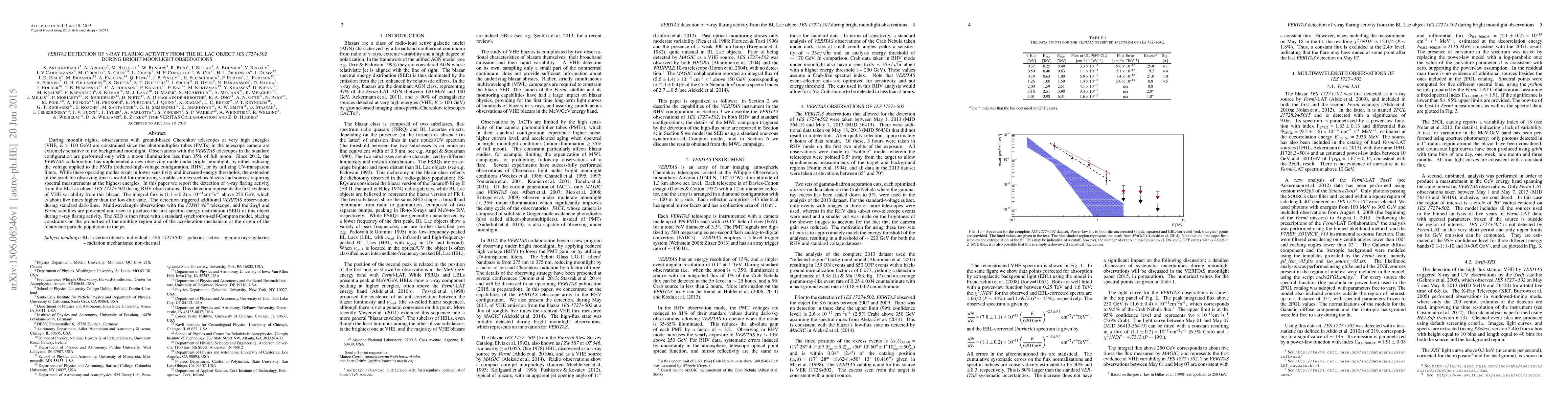 During moonlit nights, observations with ground-based Cherenkov telescopes at very high energies (VHE, $E>100$ GeV) are constrained since the photomultiplier tubes (PMTs) in the telescope camera are extremely sensitive to the background moonlight. Observations with the VERITAS telescopes in the standard configuration are performed only with a moon illumination less than 35$\%$ of full moon. Since 2012, the VERITAS collaboration has implemented a new observing mode under bright moonlight, by either reducing the voltage applied to the PMTs (reduced-high-voltage configuration, RHV), or by utilizing UV-transparent filters. While these operating modes result in lower sensitivity and increased energy thresholds, the extension of the available observing time is useful for monitoring variable sources such as blazars and sources requiring spectral measurements at the highest energies. In this paper we report the detection of $\gamma$-ray flaring activity from the BL Lac object 1ES 1727+502 during RHV observations. This detection represents the first evidence of VHE variability from this blazar. The integral flux is $(1.1\pm0.2)\times10^{-11}\mathrm{cm^{-2}s^{-1}}$ above 250 GeV, which is about five times higher than the low-flux state. The detection triggered additional \veritas\ observations during standard dark-time. Multiwavelength observations with the FLWO 48" telescope, and the Swift and Fermi satellites are presented and used to produce the first spectral energy distribution (SED) of this object during $\gamma$-ray flaring activity. The SED is then fitted with a standard synchrotron-self-Compton model, placing constraints on the properties of the emitting region and of the acceleration mechanism at the origin of the relativistic particle population in the jet.