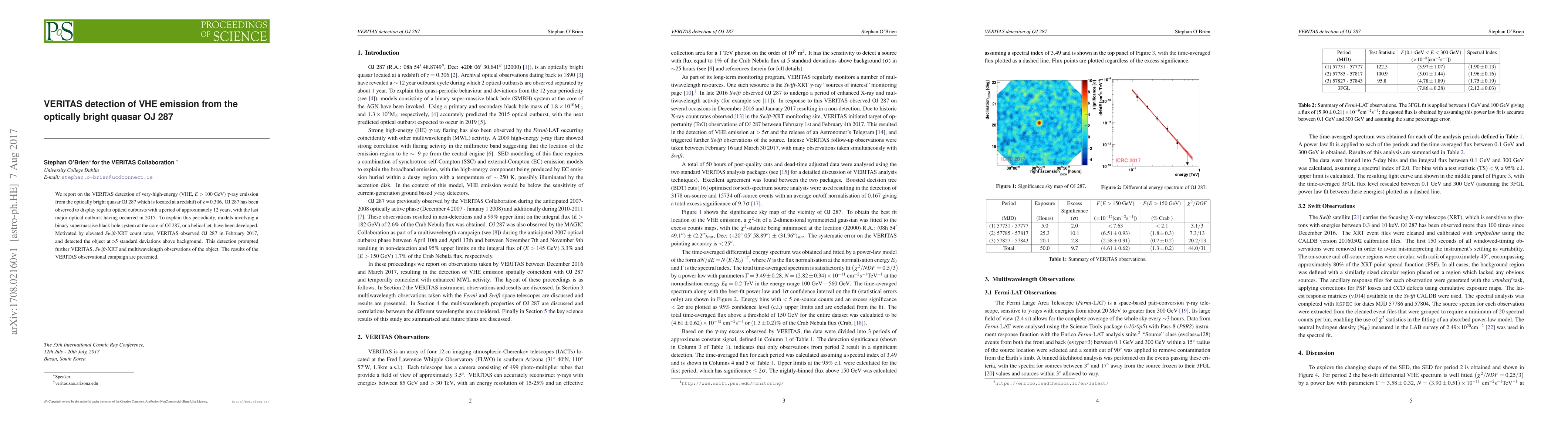VERITAS detected VHE gamma-ray emission (>100 GeV) from the quasar OJ 287, supporting binary supermassive black hole or helical jet models, due to its regular optical outbursts. Observations were prompted by elevated Swift-XRT count rates in 2017.