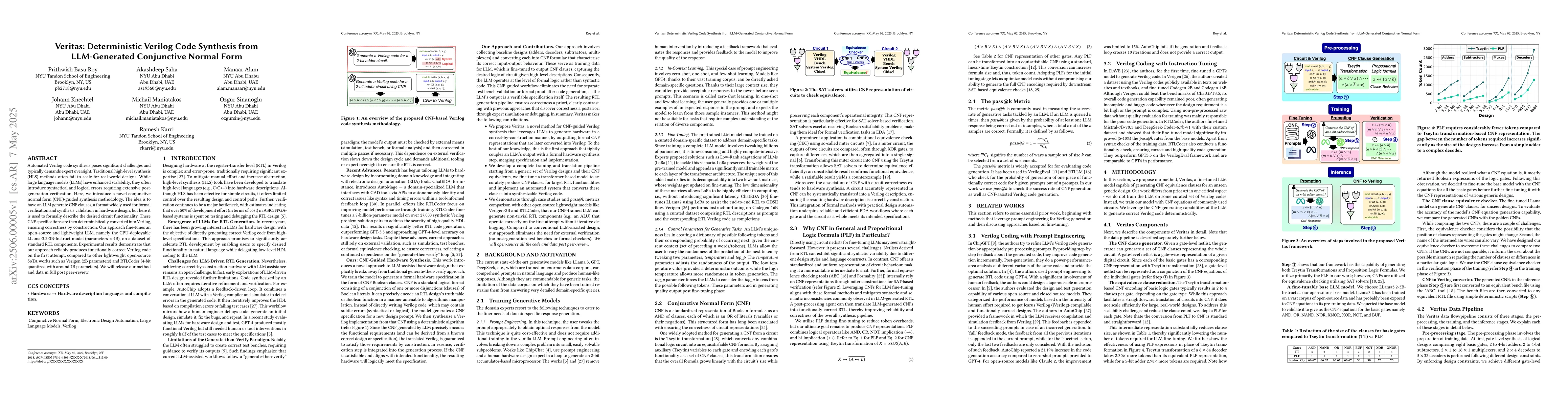 The paper introduces Veritas, a novel CNF-guided synthesis methodology that leverages lightweight LLMs to generate correct-by-construction Verilog code. It fine-tunes the open-source, CPU-deployable LLama-3.2-3B-Instruct model on standard RTL components, converting CNF specifications deterministically into Verilog, ensuring functional correctness without external verification.