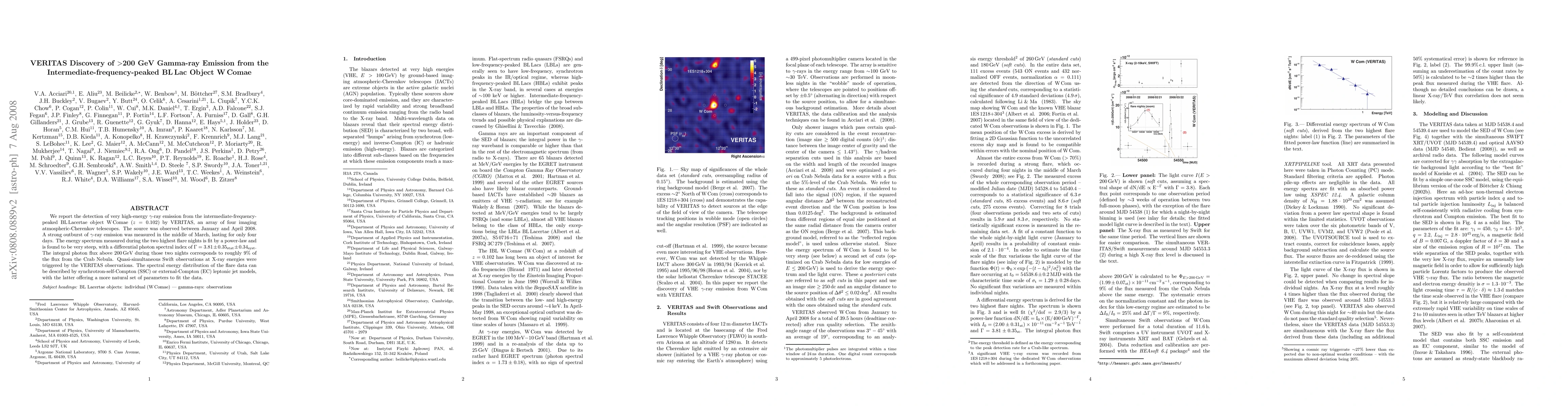 VERITAS detected very high-energy gamma-ray emission from the BL Lac object W Comae, with a notable four-day outburst in March 2008. The gamma-ray spectrum was steep, and the source's flux during the peak was comparable to 9% of the Crab Nebula's flux, suggesting a synchrotron-self-Compton or external-Compton model for the emission.