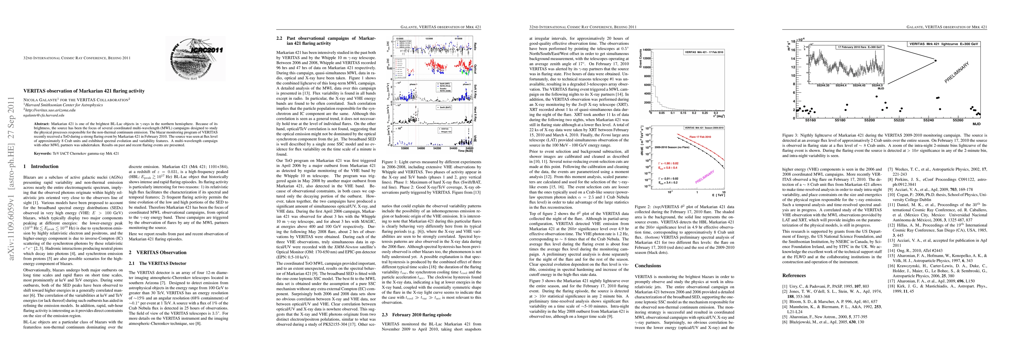 The VERITAS observatory detected significant flaring activity from Markarian 421 in February 2010, with the source reaching a flux level of approximately 8 Crab units. This event was accompanied by spectral evolution and variability, prompting a coordinated multi-wavelength campaign to study the physical processes behind the blazar's non-thermal emission.