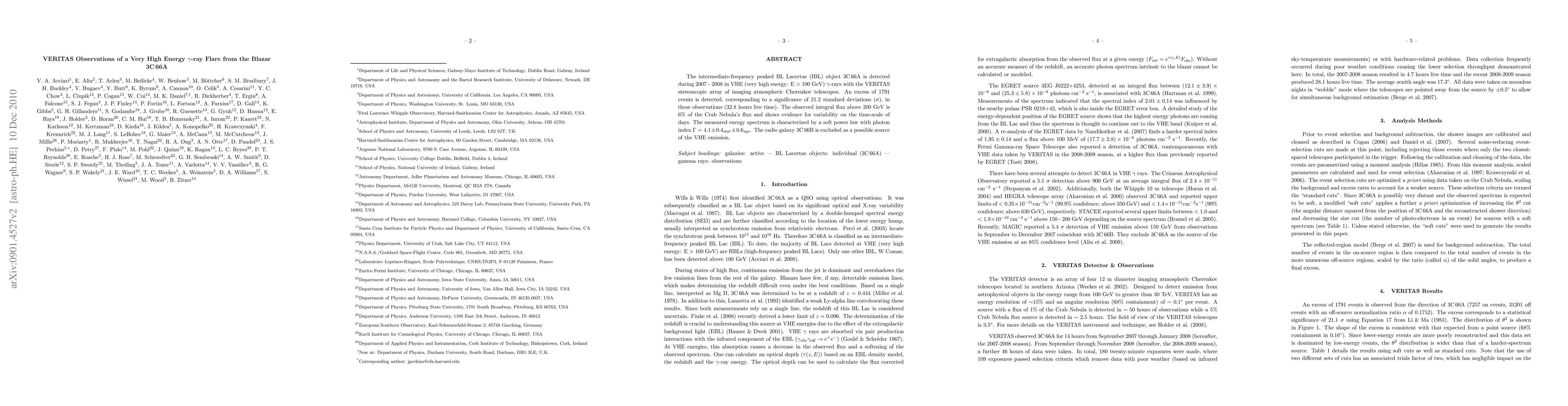 VERITAS detected a significant VHE gamma-ray flare from the IBL blazar 3C 66A in 2007-2008, with an excess of 1791 events showing variability on a daily timescale. The observed flux was 6% of the Crab Nebula's, with a soft power law spectrum.