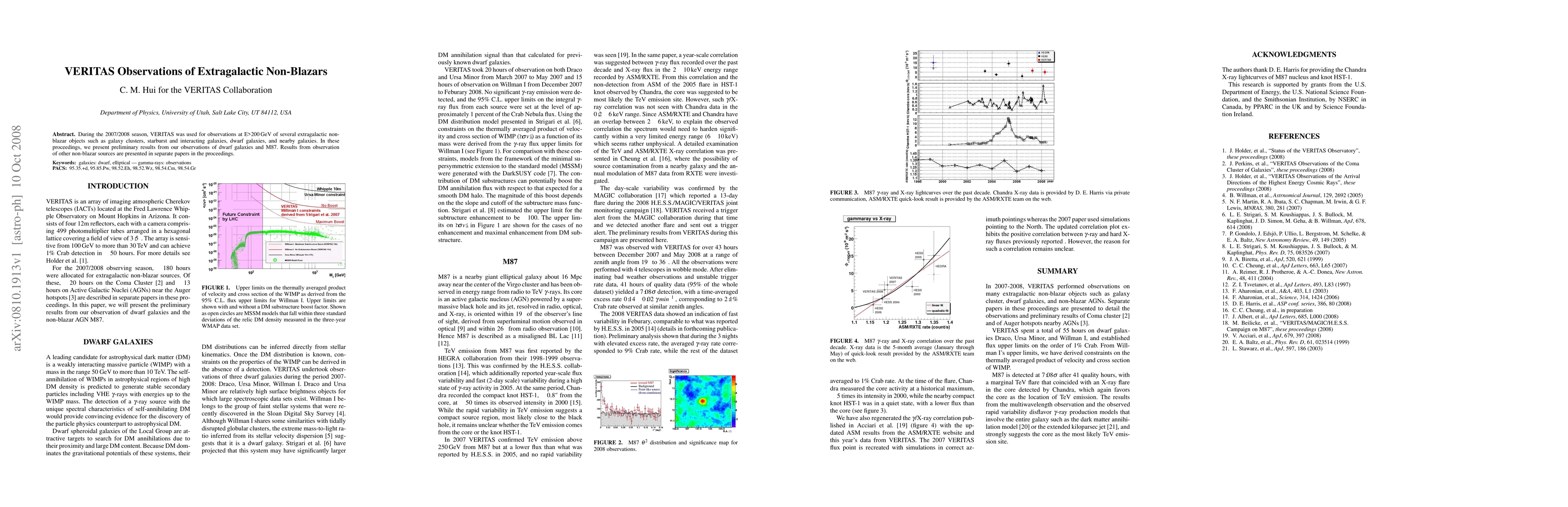 The research utilized the VERITAS array of imaging atmospheric Cherenkov telescopes to observe extragalactic non-blazar objects, including dwarf galaxies and M87, in the energy range of E>200 GeV during the 2007/2008 season, allocating approximately 180 hours for these observations.