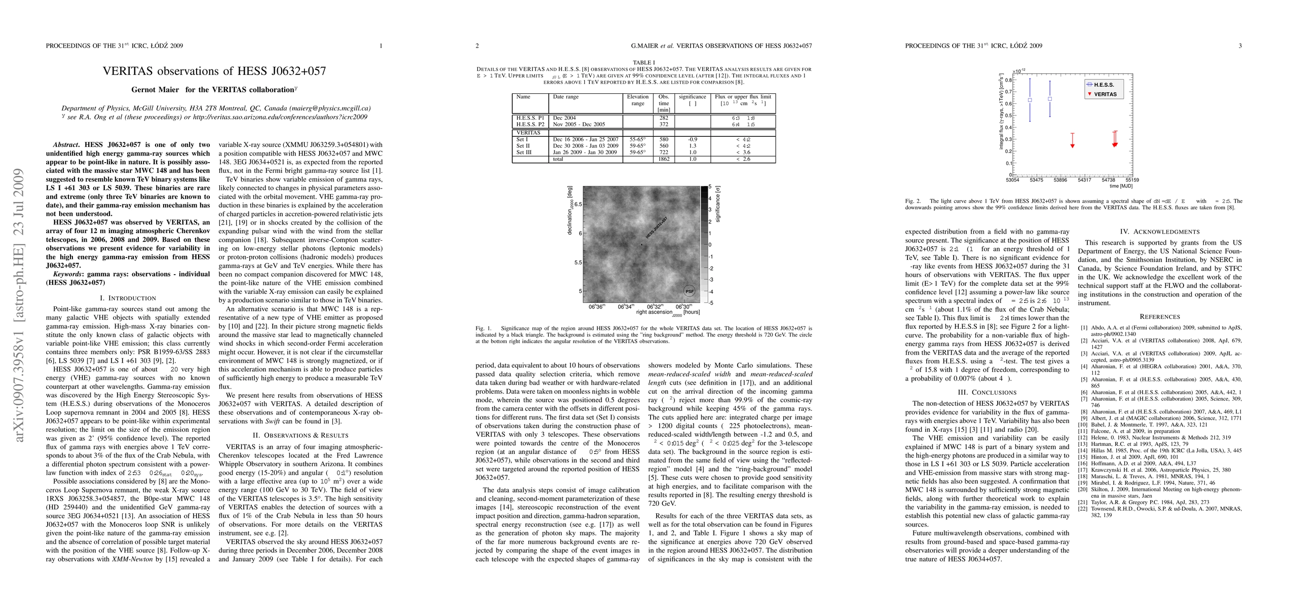 VERITAS, an array of four 12 m imaging atmospheric Cherenkov telescopes, observed HESS J0632+057 in 2006, 2008, and 2009. The observations combined good energy (15-20%) and angular (≈0.1°) resolution with a large effective area (up to 105 m²) over a wide energy range (100 GeV to 30 TeV).