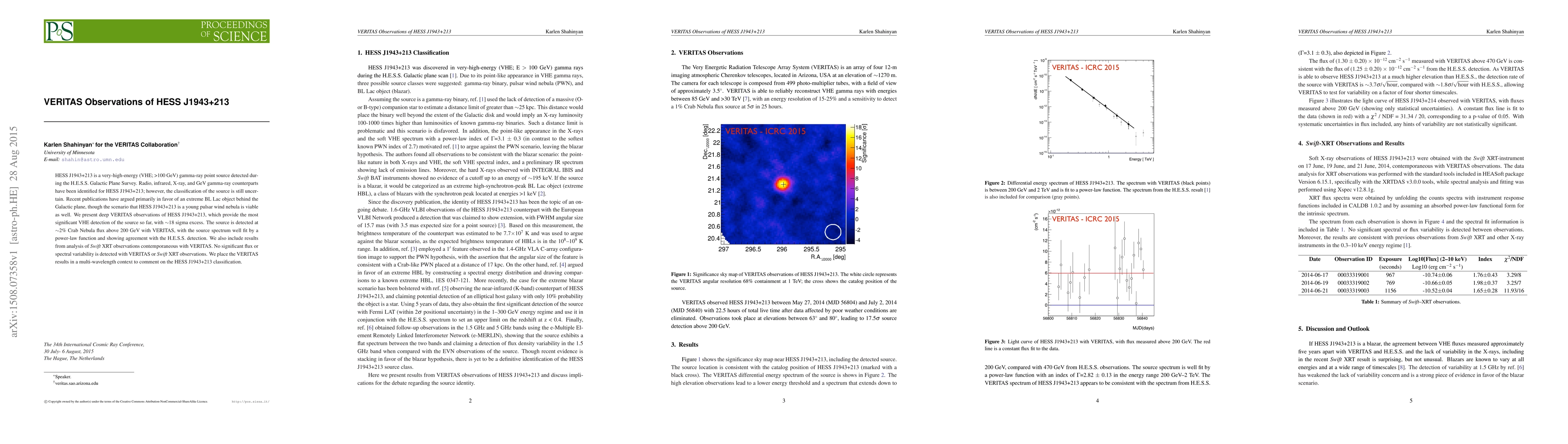 The research utilized the VERITAS array of atmospheric Cherenkov telescopes to observe HESS J1943+213 in very-high-energy gamma rays, complemented by Swift XRT observations for soft X-ray data.