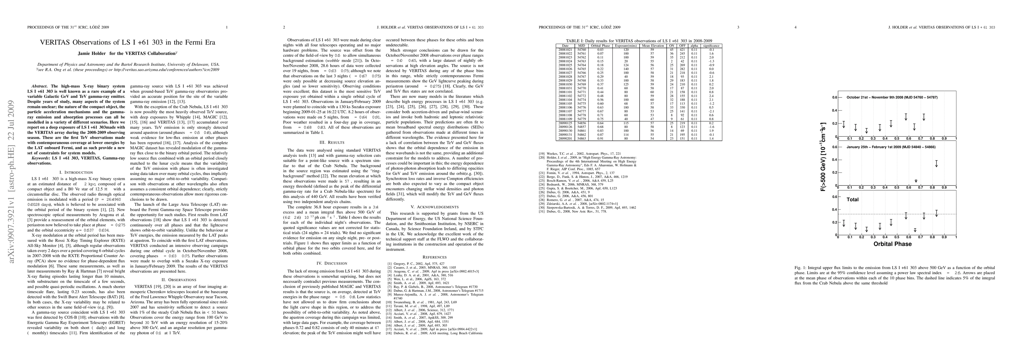 The VERITAS array observed the high-mass X-ray binary LS I +61 303 during the 2008-2009 season, providing the first TeV data with simultaneous lower-energy observations from the Fermi LAT, offering new constraints on the system’s models. These observations help clarify the nature of the compact object and gamma-ray emission mechanisms.