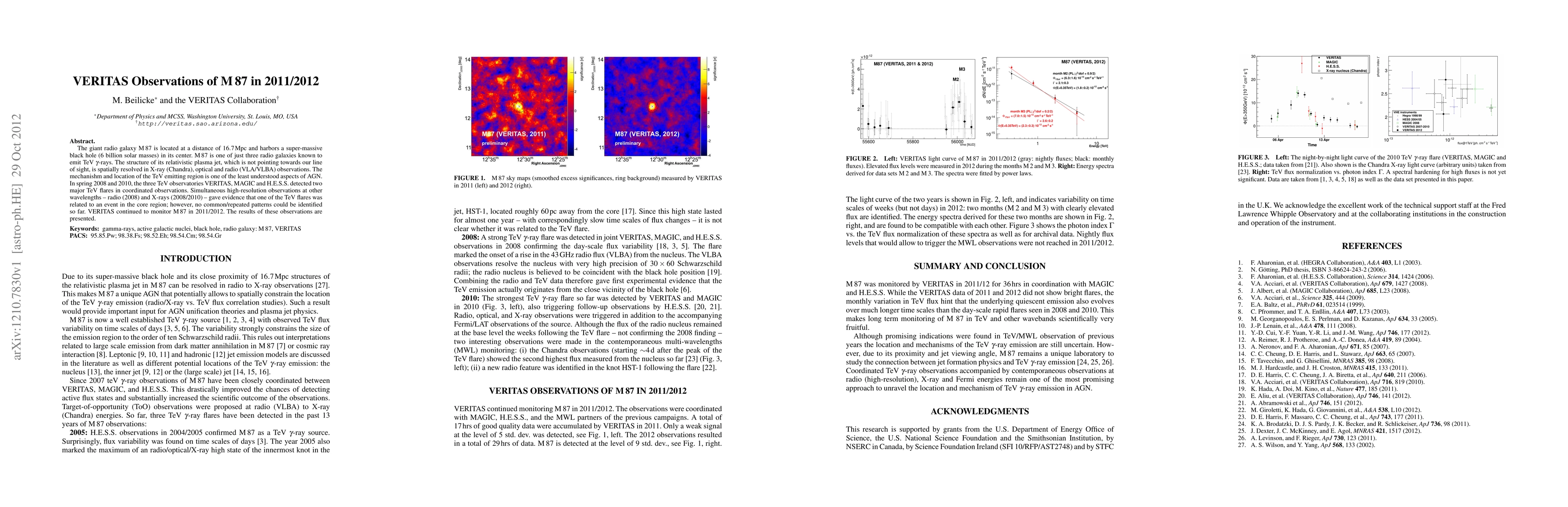 VERITAS observations from 2011/2012 of M 87, a giant radio galaxy with a supermassive black hole, revealed ongoing activity in its relativistic jet, while the mechanism and location of its TeV gamma-ray emissions remain elusive despite coordinated multi-wavelength monitoring.