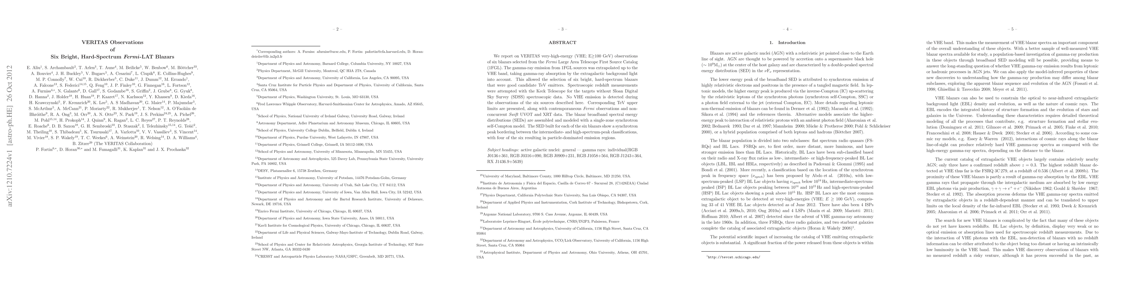VERITAS conducted observations of six bright, hard-spectrum Fermi-LAT blazars, finding no very-high-energy gamma-ray emission; however, they presented TeV upper limits and modeled the blazars' broadband spectral energy distributions with a synchrotron self-Compton model.