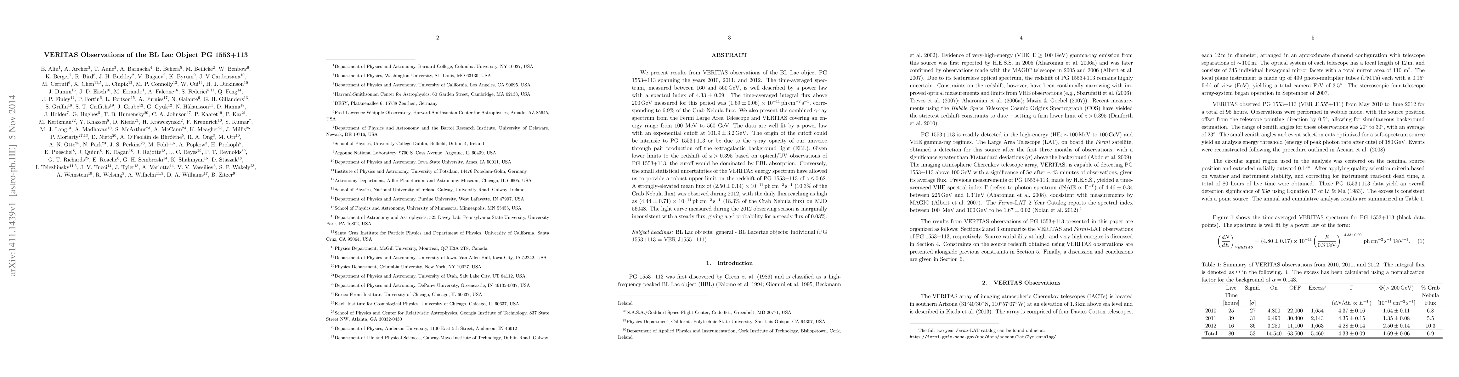 The VERITAS telescope observed PG 1553+113, a BL Lac object, over three years, revealing a well-described power-law spectrum with an exponential cutoff at 101.9 GeV, suggesting either intrinsic or extragalactic background light absorption.