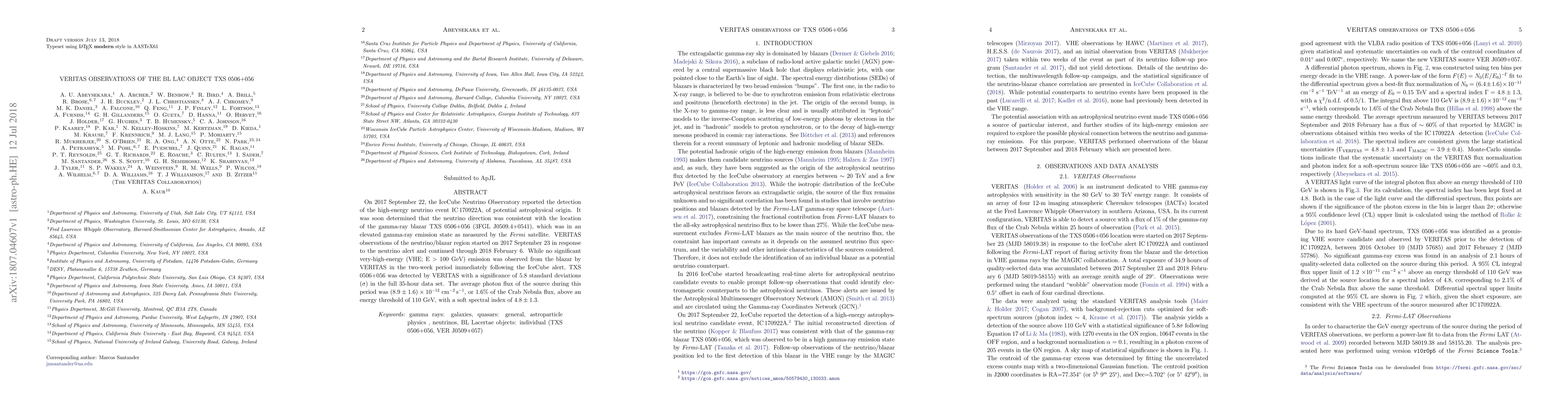 The research utilized VERITAS observations in the very-high-energy (VHE; E > 100 GeV) range in response to an IceCube neutrino alert from TXS 0506+056, a BL Lac object in an elevated gamma-ray emission state.