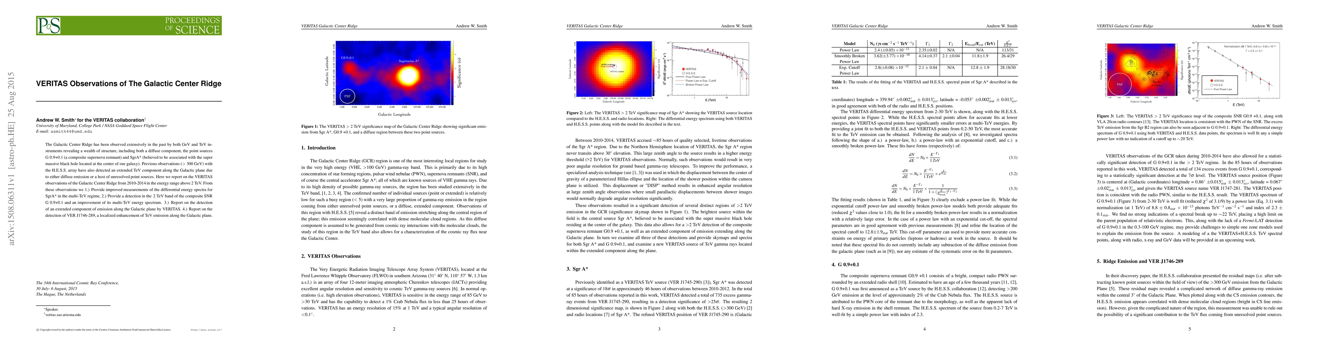The Galactic Center Ridge has been observed extensively in the past by both GeV and TeV instruments revealing a wealth of structure, including both a diffuse component, the point sources G0.9+0.1 (a composite supernova remnant) and SgrA* (believed to be associated with the super massive black hole located at the center of our galaxy). Previous observations (> 300 GeV) with the H.E.S.S. array have also detected an extended TeV component along the Galactic plane due to either diffuse emission or a host of unresolved point sources. Here we report on the VERITAS observations of the Galactic Center Ridge from 2010-2014 in the energy range above 2 TeV. From these observations we 1.) Provide improved measurements of the differential energy spectra for SgrA* in the multi-TeV regime, 2.) Provide a detection in the >2 TeV band of the composite SNR G0.9+0.1 and an improvement of its multi-TeV energy spectrum. 3.) Report on the detection of an extended component of emission along the Galactic plane by VERITAS. 4.) Report on the detection of VER J1746-289, a localized enhancement of TeV emission along the Galactic plane.