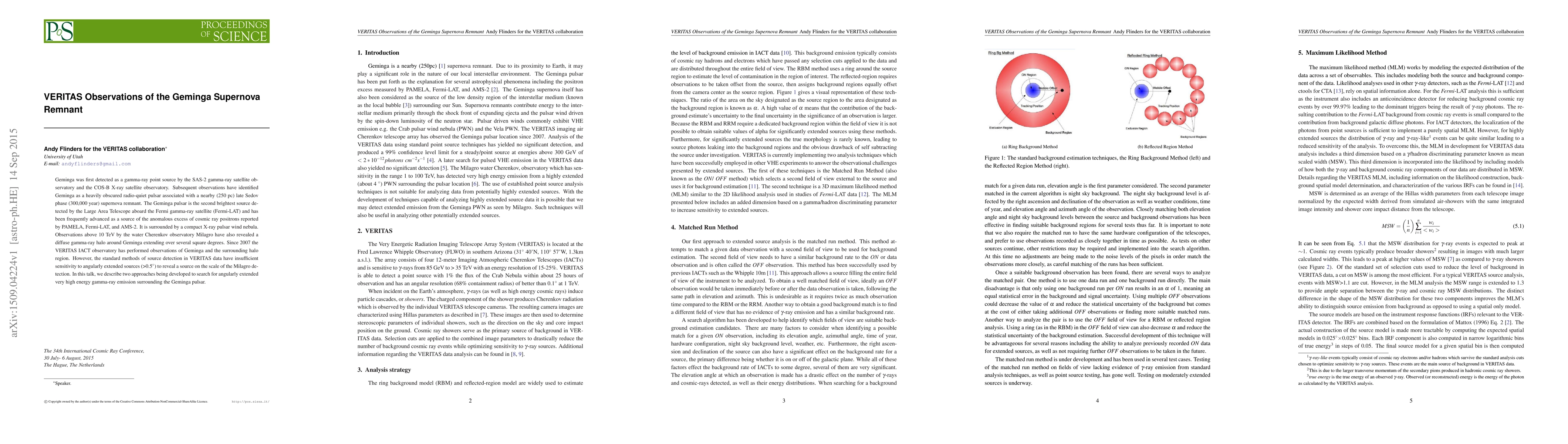 The VERITAS observatory has been observing the Geminga supernova remnant, a gamma-ray source associated with a pulsar, and is developing new methods to detect extended very high energy gamma-ray emissions beyond the sensitivity of standard detection techniques. These efforts aim to explore the potential link between Geminga and the diffuse gamma-ray halo previously detected by Milagro.