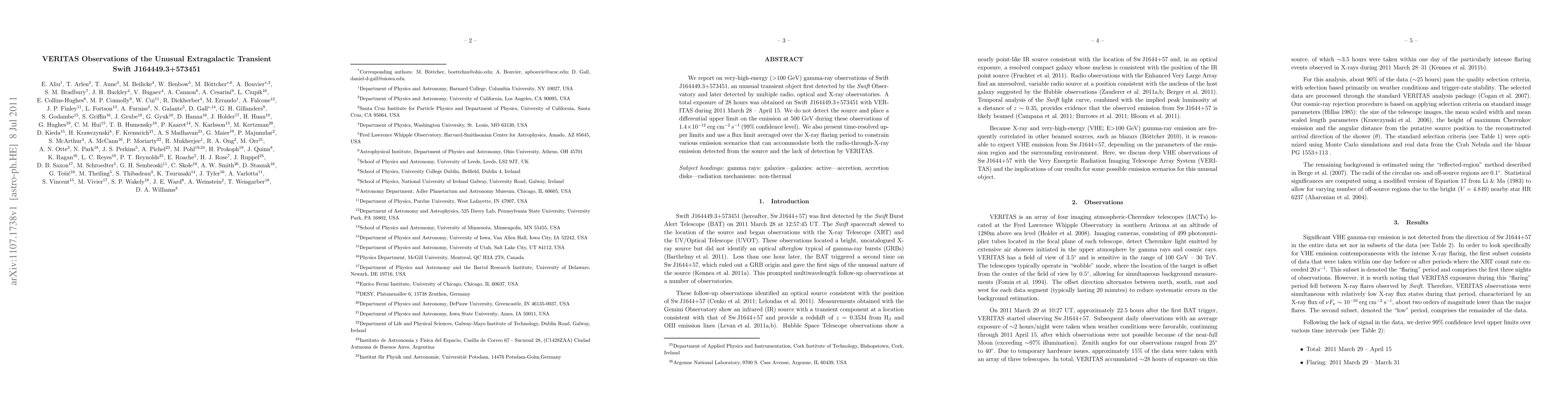 The VERITAS telescope detected no high-energy gamma-ray emission from Swift J164449.3+573451, a transient object first observed in X-rays and radio waves, setting an upper limit on its energy output.