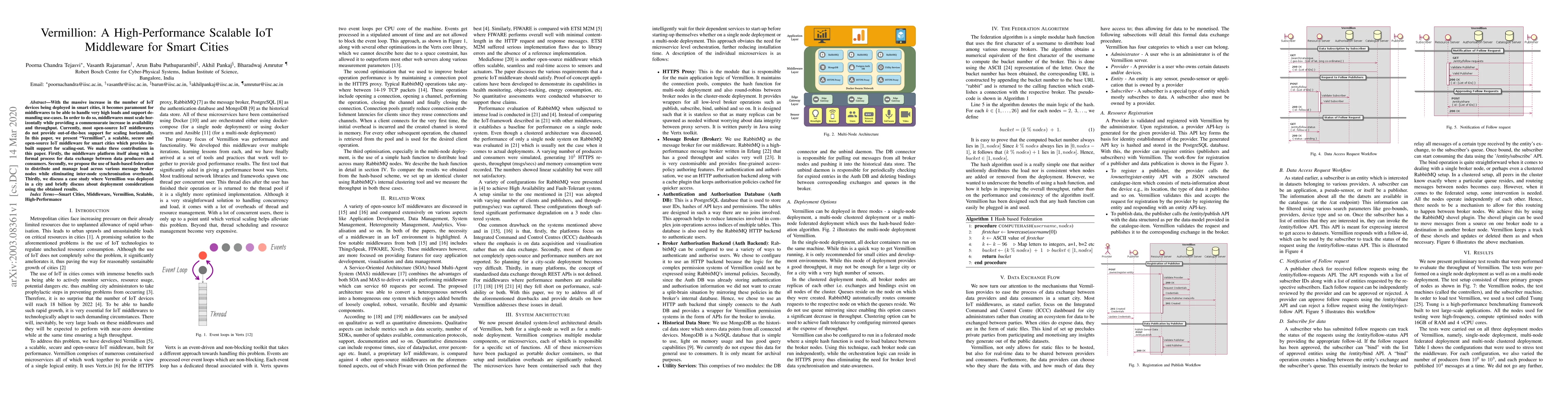 "Vermillion" is a high-performance, scalable IoT middleware designed to handle the high loads and demanding use-cases of smart cities. It features built-in support for horizontal scaling, hash-based federation for load distribution, and a case study demonstrating its deployment and effectiveness.