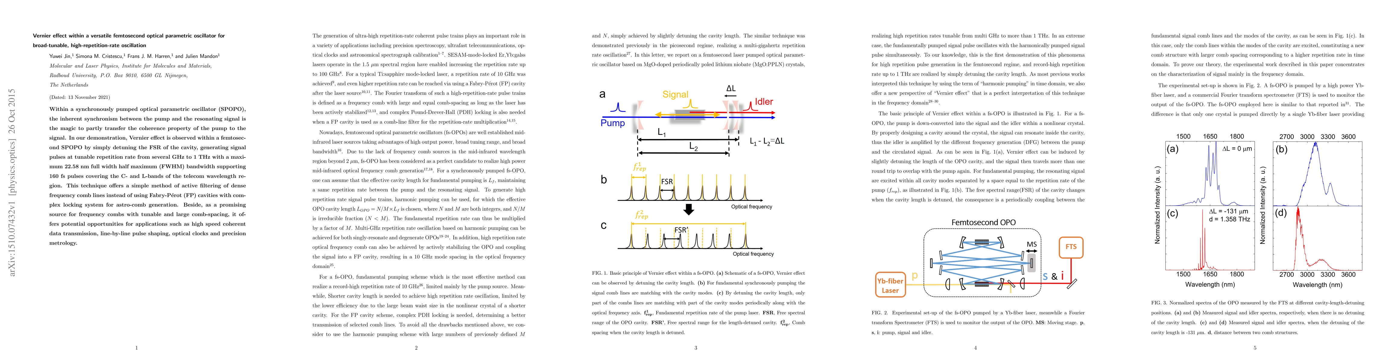 This paper demonstrates the Vernier effect in a femtosecond optical parametric oscillator, achieving tunable repetition rates from several GHz to 1 THz and broad bandwidths. The technique offers a simple method for active filtering of frequency comb lines, with potential applications in high-speed data transmission and precision metrology.