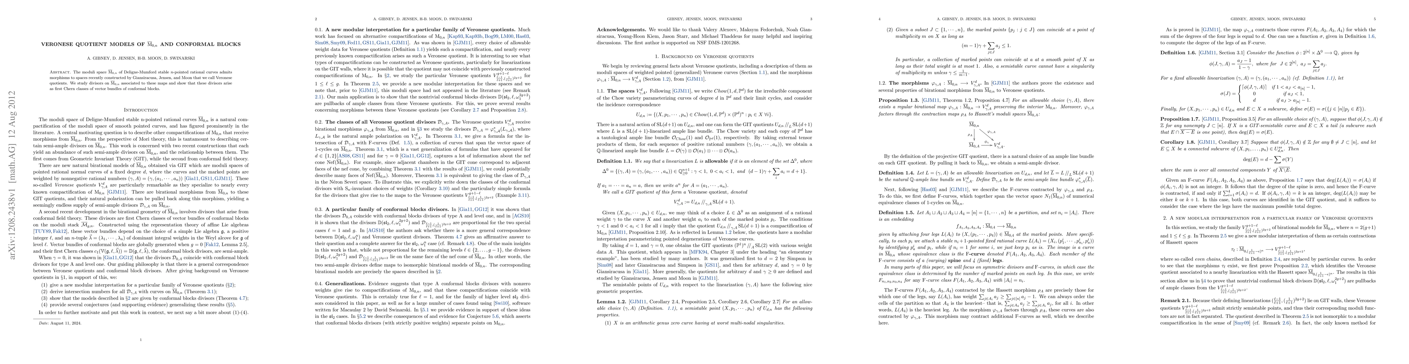 The paper explores the relationship between the moduli space $\bar{M}_{0,n}$ and Veronese quotient models, showing that divisors on $\bar{M}_{0,n}$ correspond to the first Chern classes of vector bundles of conformal blocks.