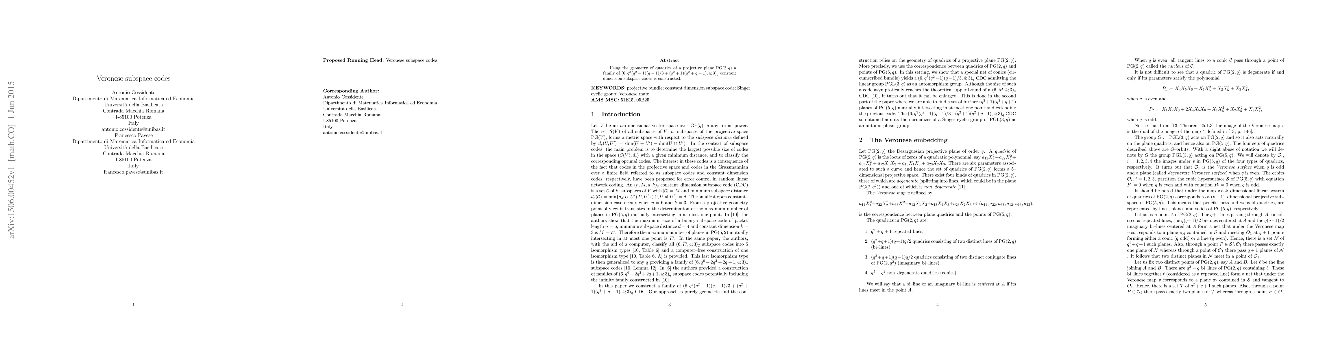 Summary: This paper constructs a family of Veronese subspace codes using the correspondence between quadrics in ${\rm PG}(2,q)$ and points in ${\rm PG}(5,q)$, yielding codes with parameters $(6,q^3(q^2-1)(q-1)/3+(q^2+1)(q^2+q+1),4;3)_q$.