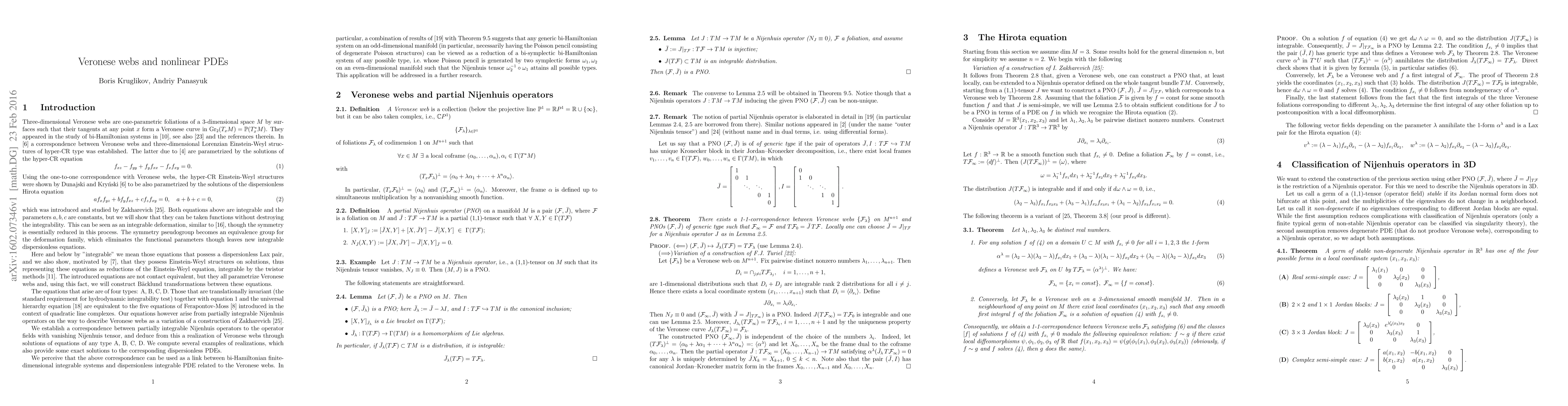 Veronese webs are closely related to bi-Hamiltonian systems, as was shown by Gelfand and Zakharevich. Recently a correspondence between Veronese three-dimensional webs and three-dimensional Einstein-Weyl structures of hyper-CR type was established. The latter were parametrized by Dunajski and Krynski via the solutions of the dispersionless Hirota equation. In this paper we show relations of Veronese three-dimensional webs to several other integrable equations, deform these equations preserving integrability via a dispersionless Lax pair and compute the corresponding contact symmetries, Backlund transformations and Einstein-Weyl structures. Realization of Veronese webs through solutions of these deformed integrable PDE is based on a correspondence between partially integrable Nijenhuis operators to the operator fields with vanishing Nijenhuis tensor. This correspondence could be used to construct a link between bi-Hamiltonian finite-dimensional integrable systems and dispersionless integrable PDE related to the Veronese webs.
