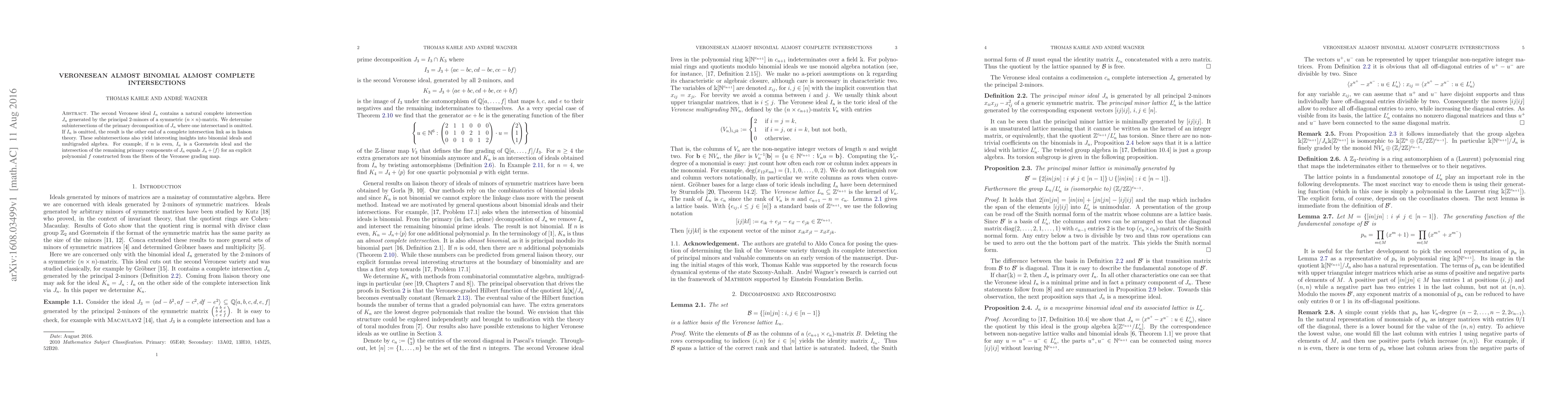 The second Veronese ideal $I_n$ contains a natural complete intersection $J_n$ generated by the principal $2$-minors of a symmetric $(n\times n)$-matrix. We determine subintersections of the primary decomposition of $J_n$ where one intersectand is omitted. If $I_n$ is omitted, the result is the other end of a complete intersection link as in liaison theory. These subintersections also yield interesting insights into binomial ideals and multigraded algebra. For example, if $n$ is even, $I_n$ is a Gorenstein ideal and the intersection of the remaining primary components of $J_n$ equals $J_n+\langle f \rangle$ for an explicit polynomial $f$ constructed from the fibers of the Veronese grading map.