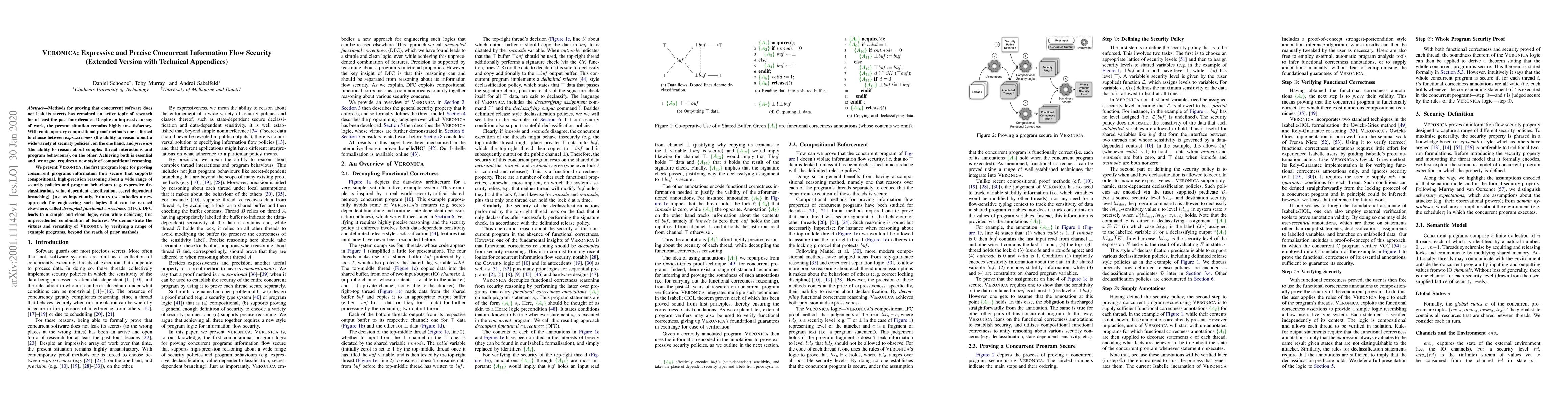 Methods for proving that concurrent software does not leak its secrets has remained an active topic of research for at least the past four decades. Despite an impressive array of work, the present situation remains highly unsatisfactory. With contemporary compositional proof methods one is forced to choose between expressiveness (the ability to reason about a wide variety of security policies), on the one hand, and precision (the ability to reason about complex thread interactions and program behaviours), on the other. Achieving both is essential and, we argue, requires a new style of compositional reasoning. We present VERONICA, the first program logic for proving concurrent programs information flow secure that supports compositional, high-precision reasoning about a wide range of security policies and program behaviours (e.g. expressive de-classification, value-dependent classification, secret-dependent branching). Just as importantly, VERONICA embodies a new approach for engineering such logics that can be re-used elsewhere, called decoupled functional correctness (DFC). DFC leads to a simple and clean logic, even while achieving this unprecedented combination of features. We demonstrate the virtues and versatility of VERONICA by verifying a range of example programs, beyond the reach of prior methods.