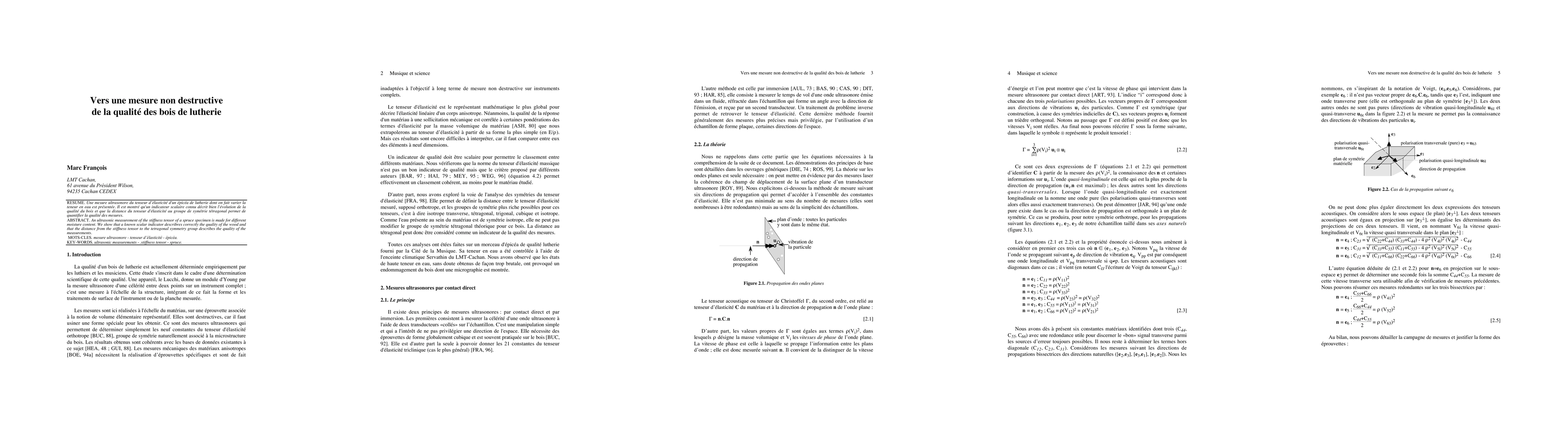 An ultrasonic measurement of the stiffness tensor of a spruce specimen is made for different moisture content. We show that a known scalar indicator describres correctly the quality of the wood and that the distance from the stiffness tensor to the tetragonal symmetry group describes the quality of the measurements. -- Une mesure ultrasonore du tenseur d'\'elasticit\'e d'un \'epic\'ea de lutherie dont on fait varier la teneur en eau est pr\'esent\'ee. Il est montr\'e qu'un indicateur scalaire connu d\'ecrit bien l'\'evolution de la qualit\'e du bois et que la distance du tenseur d'\'elasticit\'e au groupe de sym\'etrie t\'etragonal permet de quantifier la qualit\'e des mesures.