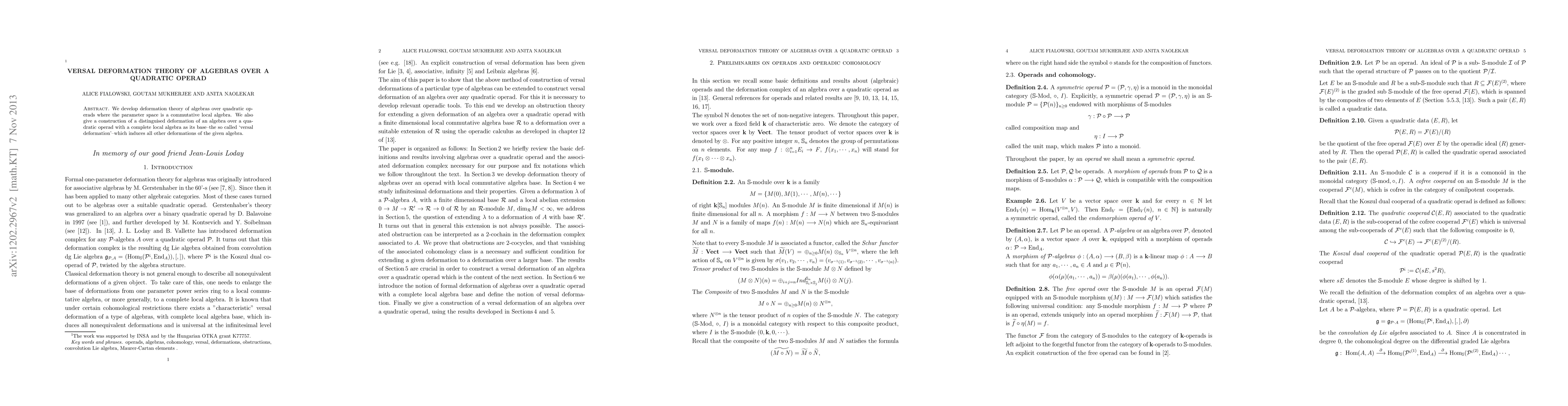This paper develops a deformation theory for algebras over quadratic operads, focusing on versal deformations with a commutative local algebra as the parameter space, and constructs a distinguished versal deformation that induces all other deformations of the given algebra.