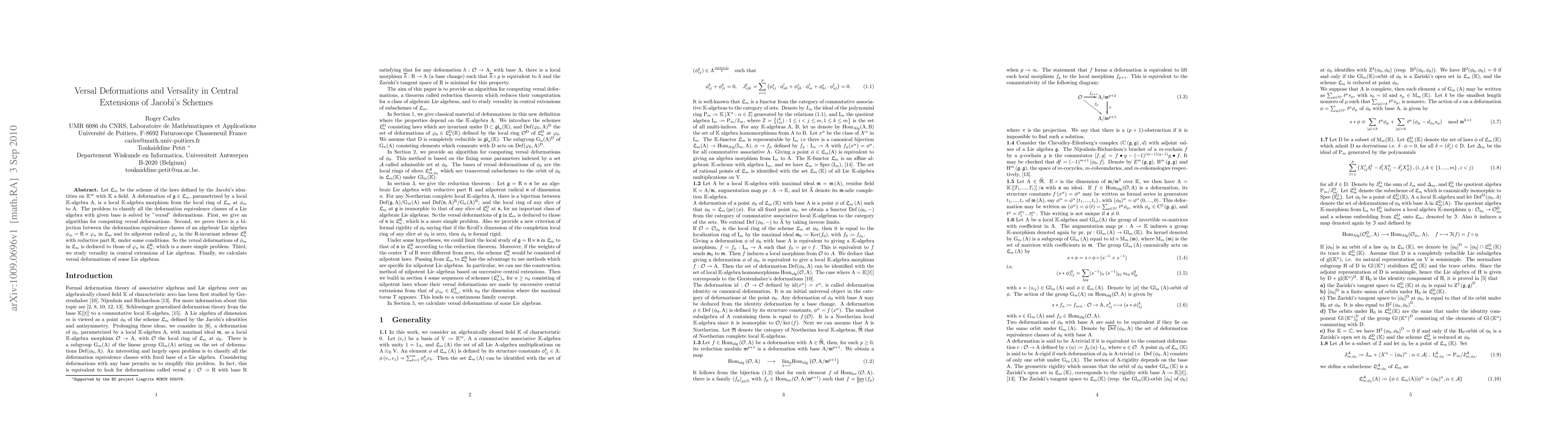Let $\L_m$ be the scheme of the laws defined by the Jacobi's identities on $\K^m$ with $\K$ a field. A deformation of $\g\in\L_m$, parametrized by a local $\K$-algebra $\A$, is a local $\K$-algebra morphism from the local ring of $\L_m$ at $\phi_m$ to $\A$. The problem to classify all the deformation equivalence classes of a Lie algebra with given base is solved by "versal" deformations. First, we give an algorithm for computing versal deformations. Second, we prove there is a bijection between the deformation equivalence classes of an algebraic Lie algebra $\phi_m=\mathrm{R}\ltimes\phi_n$ in $\L_m$ and its nilpotent radical $\phi_n$ in the $\mathrm{R}$-invariant scheme $\L_n^{\mathrm{R}}$ with reductive part $\mathrm{R}$, under some conditions. So the versal deformations of $\phi_m$ in $\L_m$ is deduced to those of $\phi_n$ in $\L_n^{\mathrm{R}}$, which is a more simple problem. Third, we study versality in central extensions of Lie algebras. Finally, we calculate versal deformations of some Lie algebras.