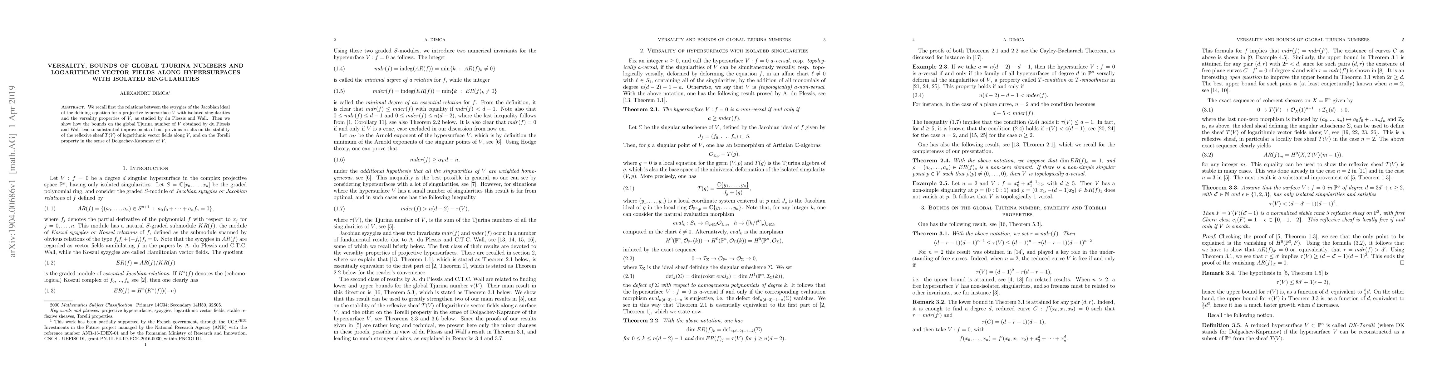 We recall first the relations between the syzygies of the Jacobian ideal of the defining equation for a projective hypersurface $V$ with isolated singularities and the versality properties of $V$, as studied by du Plessis and Wall. Then we show how the bounds on the global Tjurina number of $V$ obtained by du Plessis and Wall lead to substantial improvements of our previous results on the stability of the reflexive sheaf $T\langle V\rangle$ of logarithmic vector fields along $V$, and on the Torelli property in the sense of Dolgachev-Kapranov of $V$.