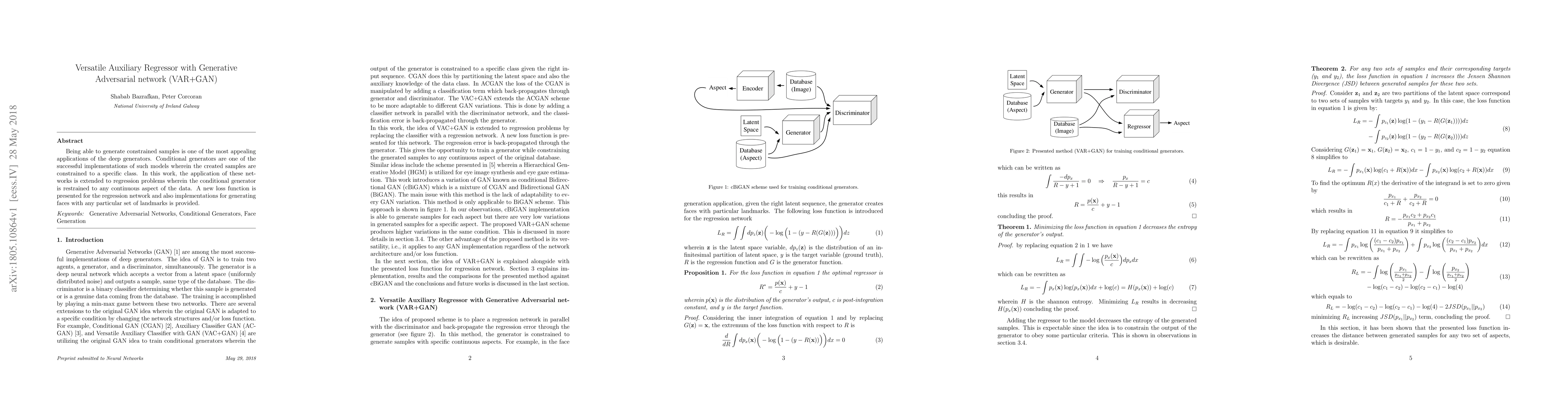Being able to generate constrained samples is one of the most appealing applications of the deep generators. Conditional generators are one of the successful implementations of such models wherein the created samples are constrained to a specific class. In this work, the application of these networks is extended to regression problems wherein the conditional generator is restrained to any continuous aspect of the data. A new loss function is presented for the regression network and also implementations for generating faces with any particular set of landmarks is provided.