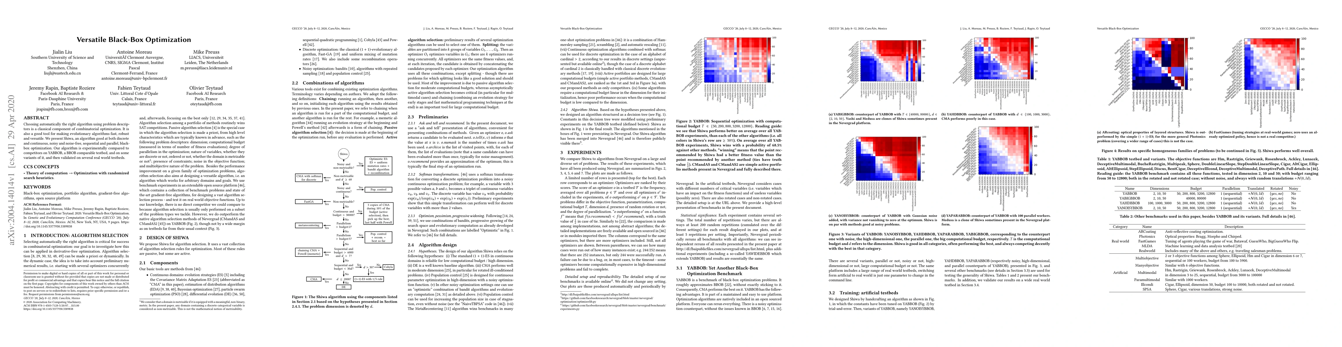 This paper introduces Shiwa, a versatile algorithm for black-box optimization that can handle both discrete and continuous problems, noise, and different parallelization schemes. It outperforms other algorithms on various testbeds, demonstrating its potential as a robust and fast tool for optimizing complex systems.