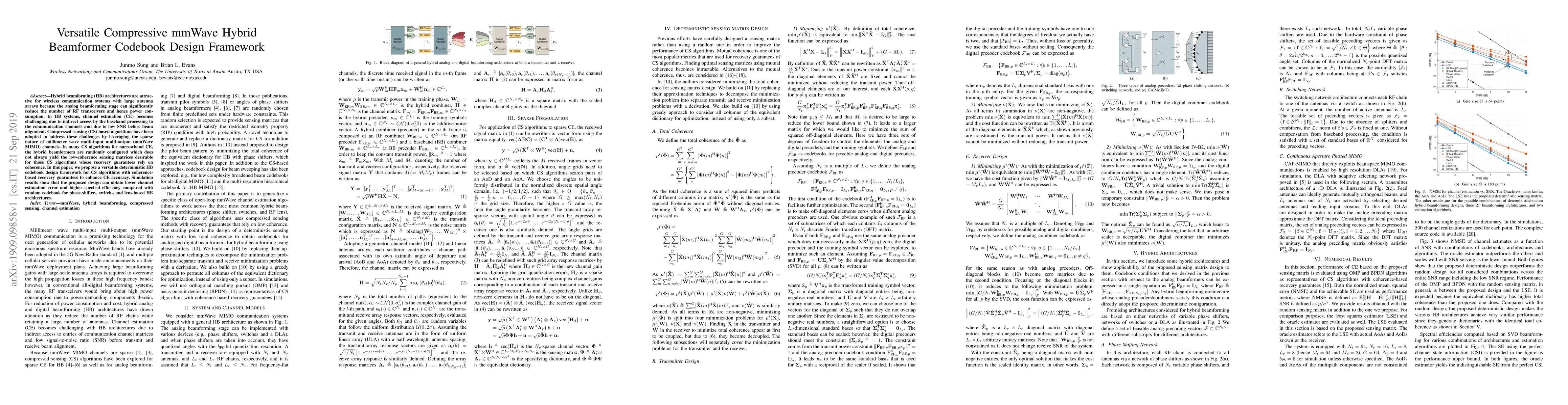 Hybrid beamforming (HB) architectures are attractive for wireless communication systems with large antenna arrays because the analog beamforming stage can significantly reduce the number of RF transceivers and hence power consumption. In HB systems, channel estimation (CE) becomes challenging due to indirect access by the baseband processing to the communication channels and due to low SNR before beam alignment. Compressed sensing (CS) based algorithms have been adopted to address these challenges by leveraging the sparse nature of millimeter wave multi-input multi-output (mmWave MIMO) channels. In many CS algorithms for narrowband CE, the hybrid beamformers are randomly configured which does not always yield the low-coherence sensing matrices desirable for those CS algorithms whose recovery guarantees rely on coherence. In this paper, we propose a versatile deterministic HB codebook design framework for CS algorithms with coherence-based recovery guarantees to enhance CE accuracy. Simulation results show that the proposed design can obtain lower channel estimation error and higher spectral efficiency compared with random codebook for phase-shifter-, switch-, and lens-based HB architectures.