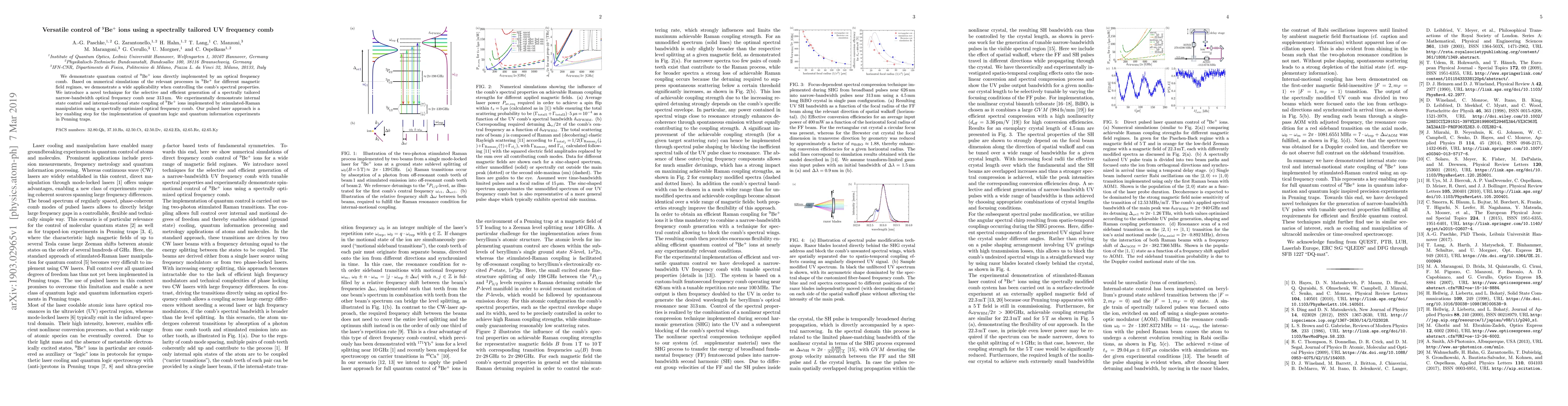 This paper presents a method for quantum control of $^9$Be$^+$ ions using a spectrally tailored UV frequency comb, demonstrating internal state manipulation and coupling via stimulated-Raman techniques. The approach enables versatile control over ion states, crucial for quantum logic and information experiments in Penning traps.