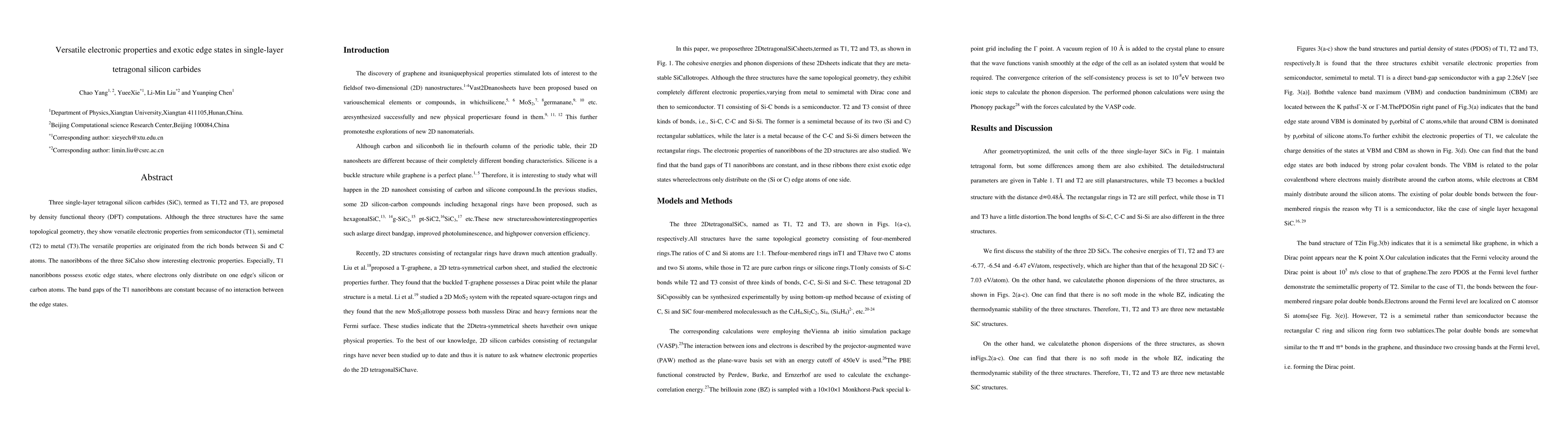 This paper proposes three single-layer tetragonal silicon carbides (SiC) with distinct electronic properties ranging from semiconductor to metallic, attributed to the varied Si-C bonds. Notably, T1 nanoribbons exhibit exotic edge states with electrons localized on one edge, maintaining a constant band gap due to non-interacting edge states.