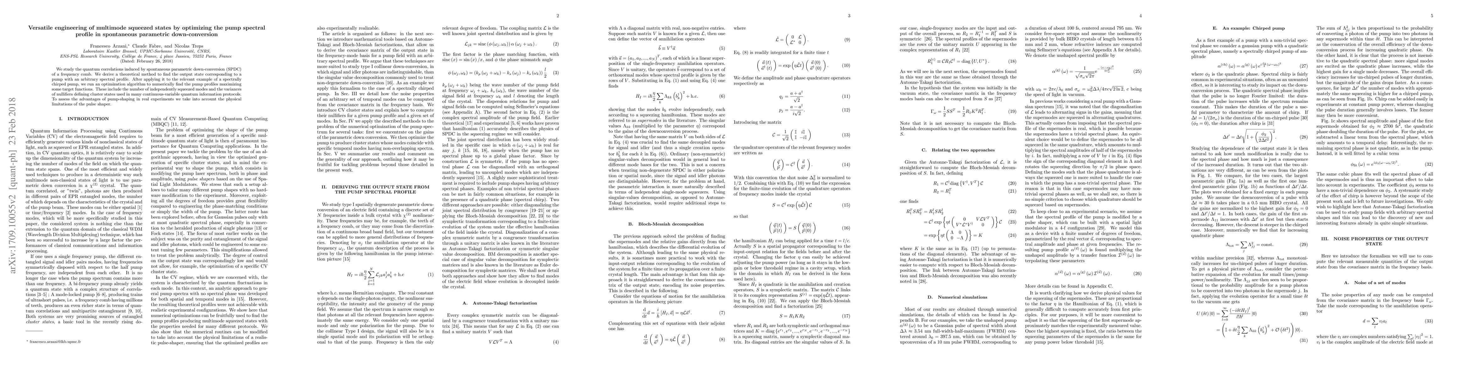 We study the quantum correlations induced by spontaneous parametric down-conversion (SPDC) of a frequency comb. We derive a theoretical method to find the output state corresponding to a pump with an arbitrary spectral profile. After applying it to the relevant example of a spectrally chirped pump, we run an optimization algorithm to numerically find the pump profiles maximizing some target functions. These include the number of independently squeezed modes and the variances of nullifiers defining cluster states used in many continuous-variable quantum information protocols. To assess the advantages of pump-shaping in real experiments we take into account the physical limitations of the pulse shaper.