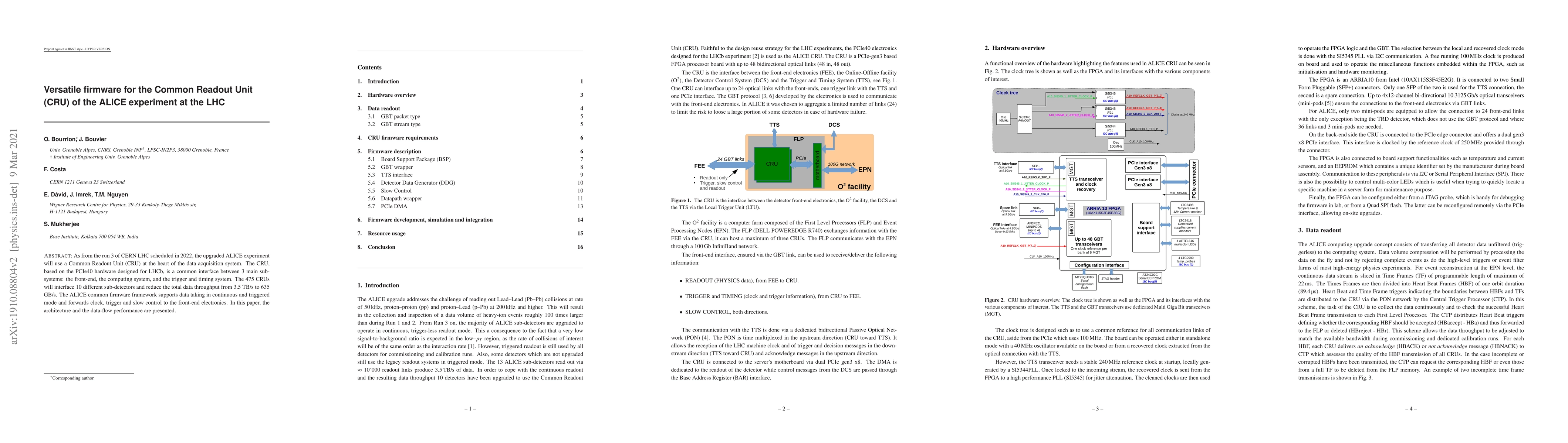 This paper details the versatile firmware for the Common Readout Unit (CRU) in the ALICE experiment at CERN's LHC, designed to interface with 10 sub-detectors and reduce data throughput from 3.5 TB/s to 635 GB/s. The CRU firmware supports continuous and triggered data acquisition modes and manages clock, trigger, and control signals.