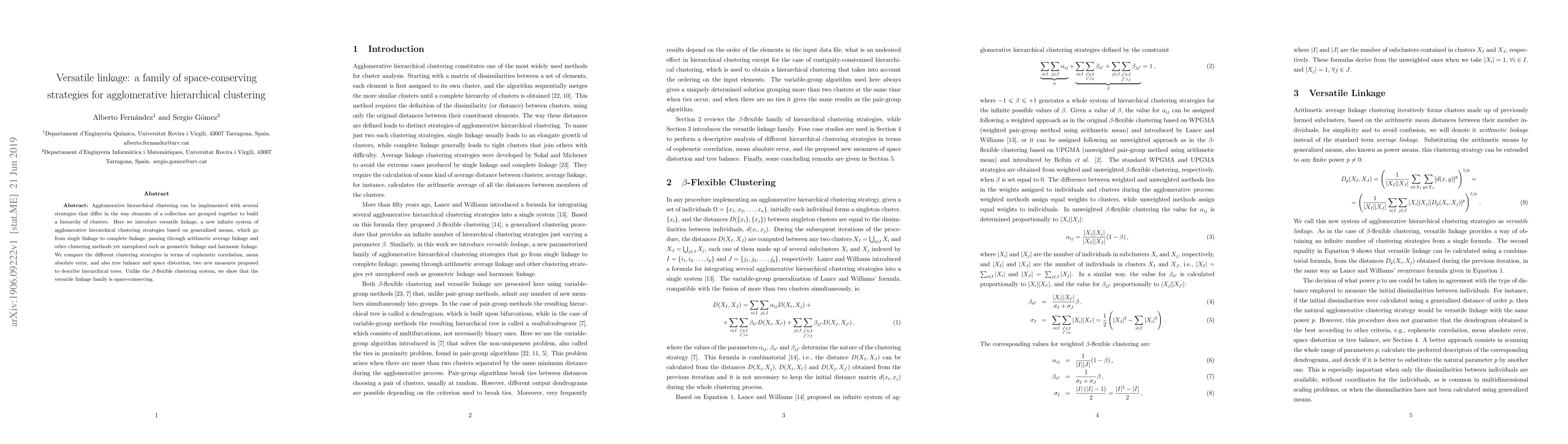 This paper introduces versatile linkage, a new infinite system of agglomerative hierarchical clustering strategies based on generalized means, ranging from single linkage to complete linkage. It evaluates these strategies using cophenetic correlation, mean absolute error, and introduces new measures for tree balance and space distortion, demonstrating that this system is space-conserving unlike the $\beta$-flexible clustering system.