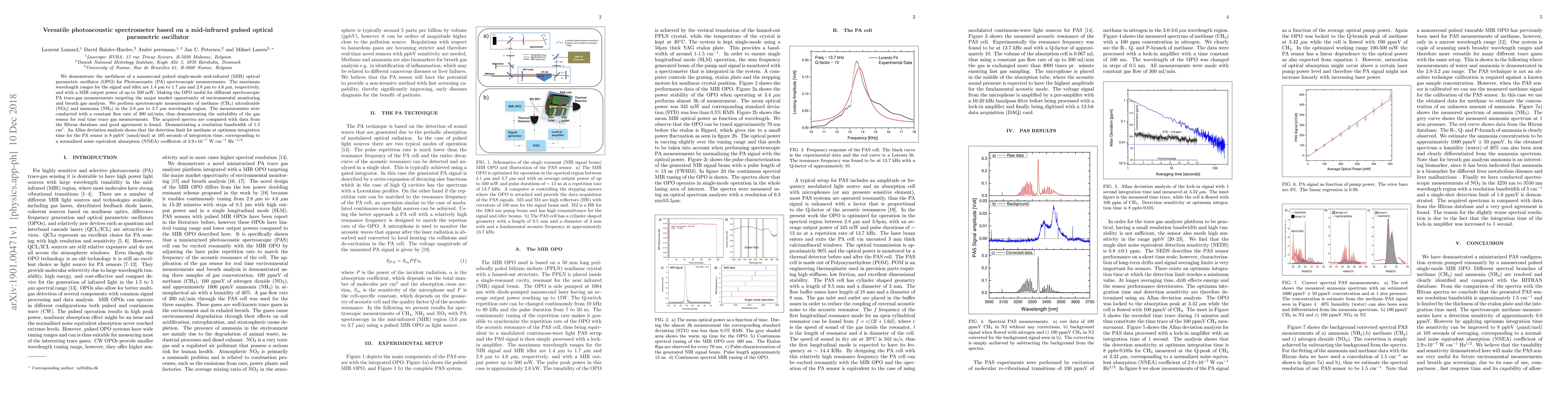 This paper presents a versatile mid-infrared pulsed optical parametric oscillator for photoacoustic spectroscopy, enabling real-time trace gas measurements with a detection limit of 8 ppbV for methane. The system demonstrates good agreement with HITRAN database data and is suitable for environmental monitoring and breath gas analysis.