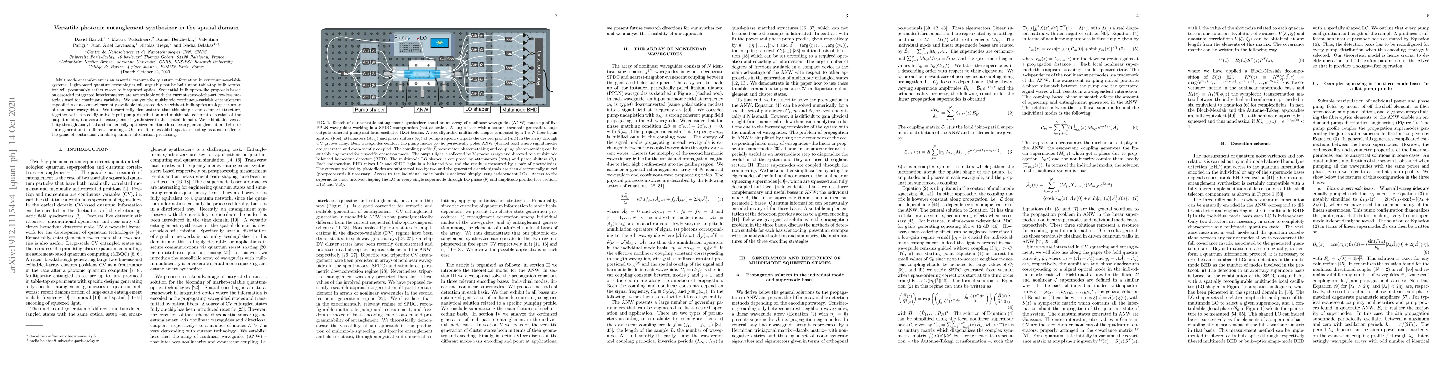 Multimode entanglement is an essential resource for quantum information in continuous-variable systems. Light-based quantum technologies will arguably not be built upon table-top bulk setups, but will presumably rather resort to integrated optics. Sequential bulk optics-like proposals based on cascaded integrated interferometers are not scalable with the current state-of-the-art low-loss materials used for continuous variables. We analyze the multimode continuous-variable entanglement capabilities of a compact currently-available integrated device without bulk-optics analog: the array of nonlinear waveguides. We theoretically demonstrate that this simple and compact structure, together with a reconfigurable input pump distribution and multimode coherent detection of the output modes, is a versatile entanglement synthesizer in the spatial domain. We exhibit this versatility through analytical and numerically optimized multimode squeezing, entanglement, and cluster state generation in different encodings. Our results re-establish spatial encoding as a contender in the game of continuous-variable quantum information processing.