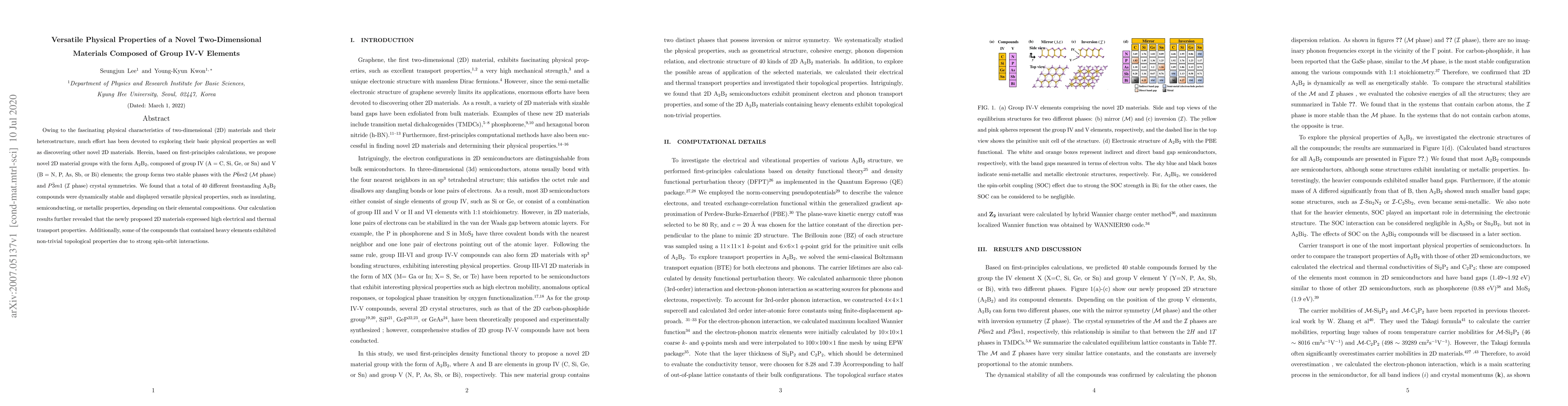 This paper proposes novel two-dimensional materials composed of group IV and V elements in an A$_2$B$_2$ configuration, revealing 40 dynamically stable compounds with versatile physical properties, including insulating, semiconducting, and metallic behaviors, alongside high electrical and thermal transport capabilities. Some compounds also exhibit non-trivial topological properties due to strong spin-orbit interactions.