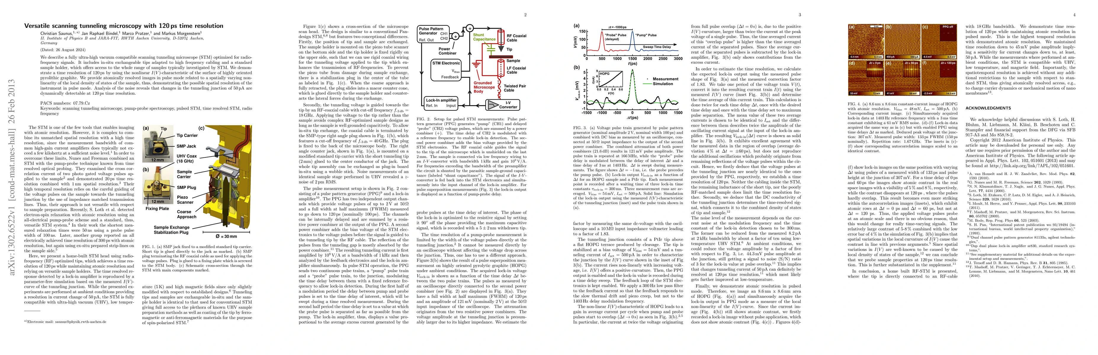 We describe a fully ultra-high vacuum compatible scanning tunneling microscope (STM) optimized for radio-frequency signals. It includes in-situ exchangeable tips adapted to high frequency cabling and a standard sample holder, which offer access to the whole range of samples typically investigated by STM. We demonstrate a time resolution of 120 ps using the nonlinear I(V)-characteristic of the surface of highly oriented pyrolithic graphite. We provide atomically resolved images in pulse mode related to a spatially varying nonlinearity of the local density of states of the sample, thus, demonstrating the possible spatial resolution of the instrument in pulse mode. Analysis of the noise reveals that changes in the tunneling junction of 50 pA are dynamically detectable at 120 ps time resolution.