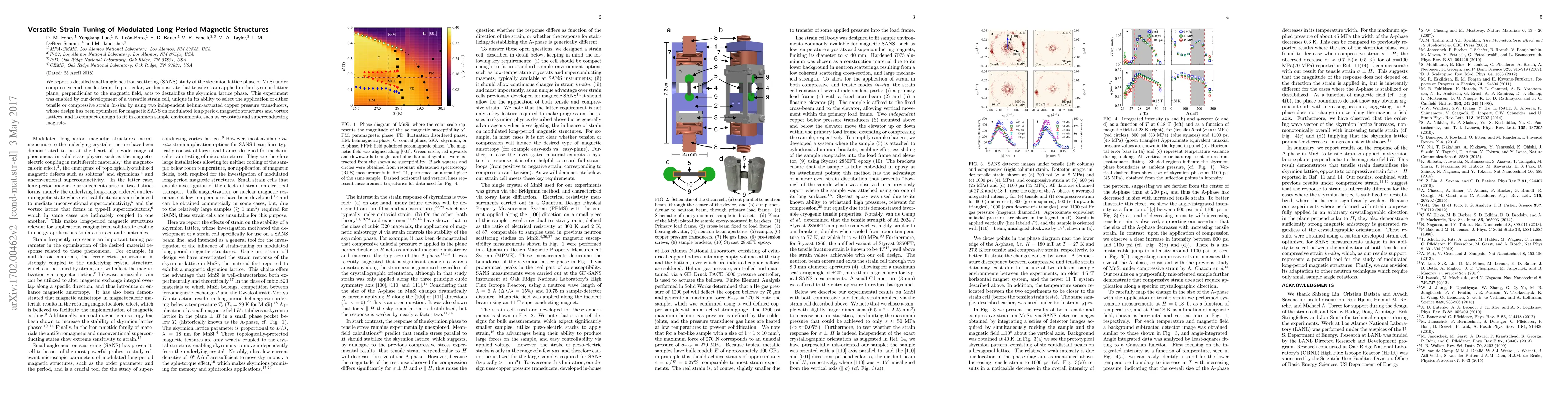 We report a detailed small-angle neutron scattering (SANS) study of the skyrmion lattice phase of MnSi under compressive and tensile strain. In particular, we demonstrate that tensile strain applied in the skyrmion lattice plane, perpendicular to the magnetic field, acts to destabilize the skyrmion lattice phase. This experiment was enabled by our development of a versatile strain cell, unique in its ability to select the application of either tensile or compressive strain in-situ by using two independent helium-actuated copper pressure transducers, whose design has been optimized for magnetic SANS on modulated long-period magnetic structures and vortex lattices, and is compact enough to fit in common sample environments, such as cryostats and superconducting magnets.