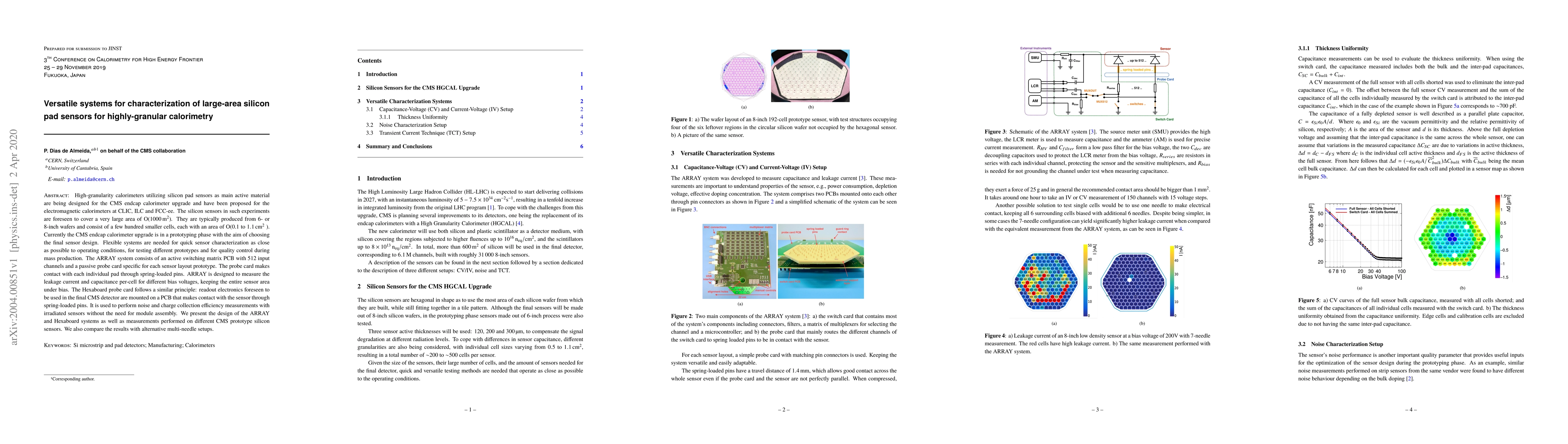 The paper presents versatile characterization systems, ARRAY and Hexaboard, designed for testing large-area silicon pad sensors in high-granularity calorimeters, such as those planned for CMS and future lepton colliders. The systems enable precise measurements of leakage current, capacitance, noise, and charge collection efficiency under operating conditions, facilitating prototype evaluation and quality control during mass production.